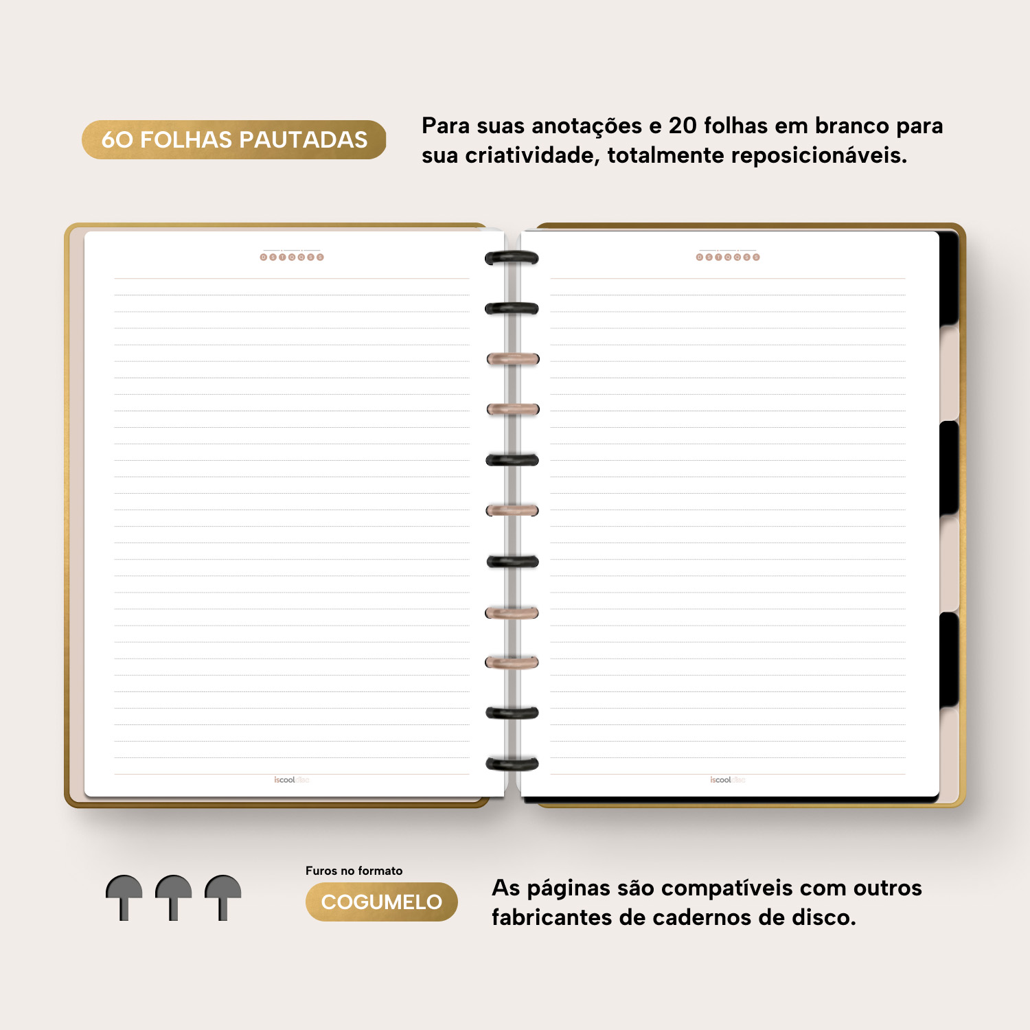 O miolo conta com 60 folhas pautadas decoradas em papel sulfite 90g (aquele papel mais “grossinho”) para que você use e abuse das suas canetas especiais, e 20 folhas em branco, ideais para explorar seu lado mais criativo ou até imprimir nelas.