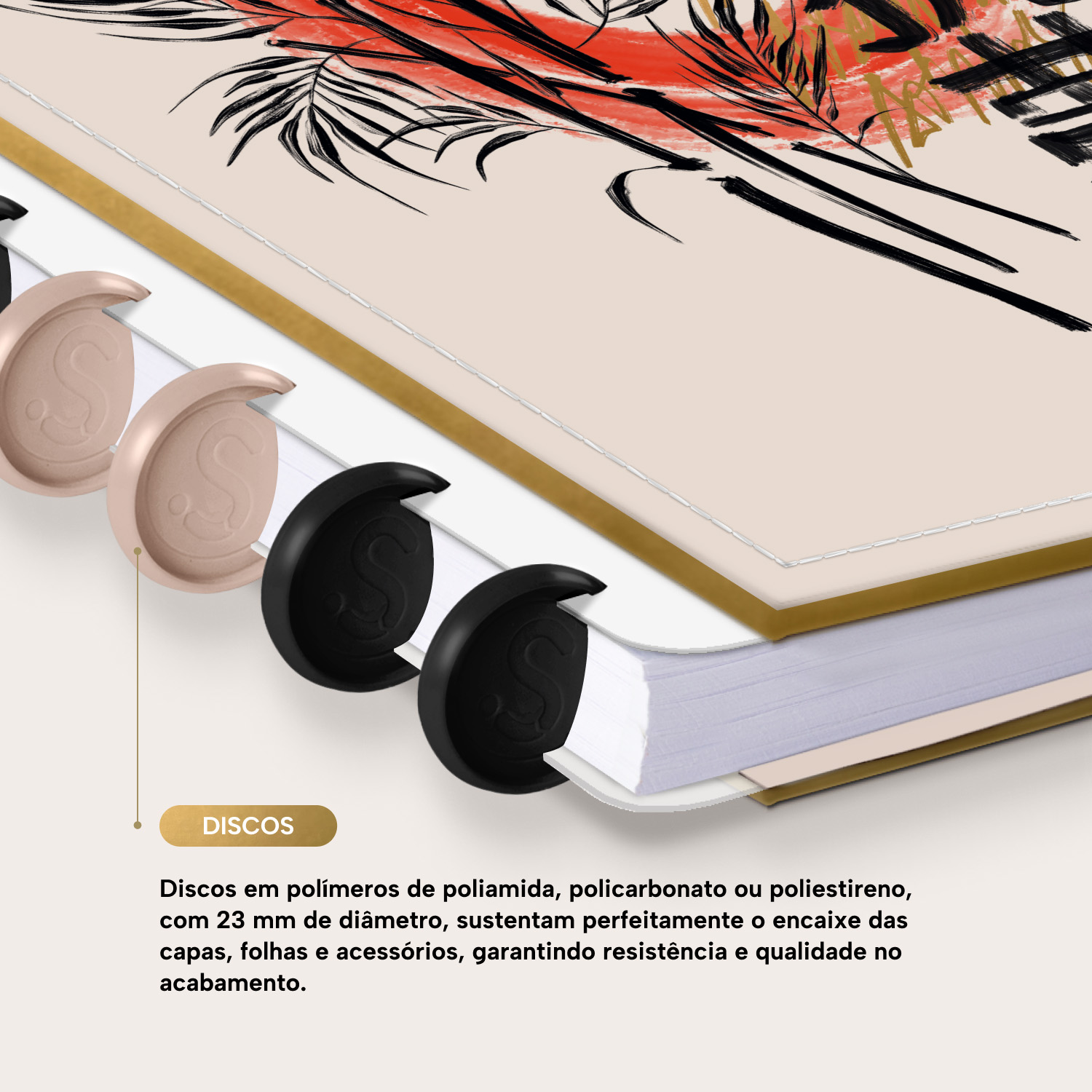 Encadernado com 11 discos M de 23mm em polímero de nylon e/ou policarbonato coloridos, fabricados no Brasil.