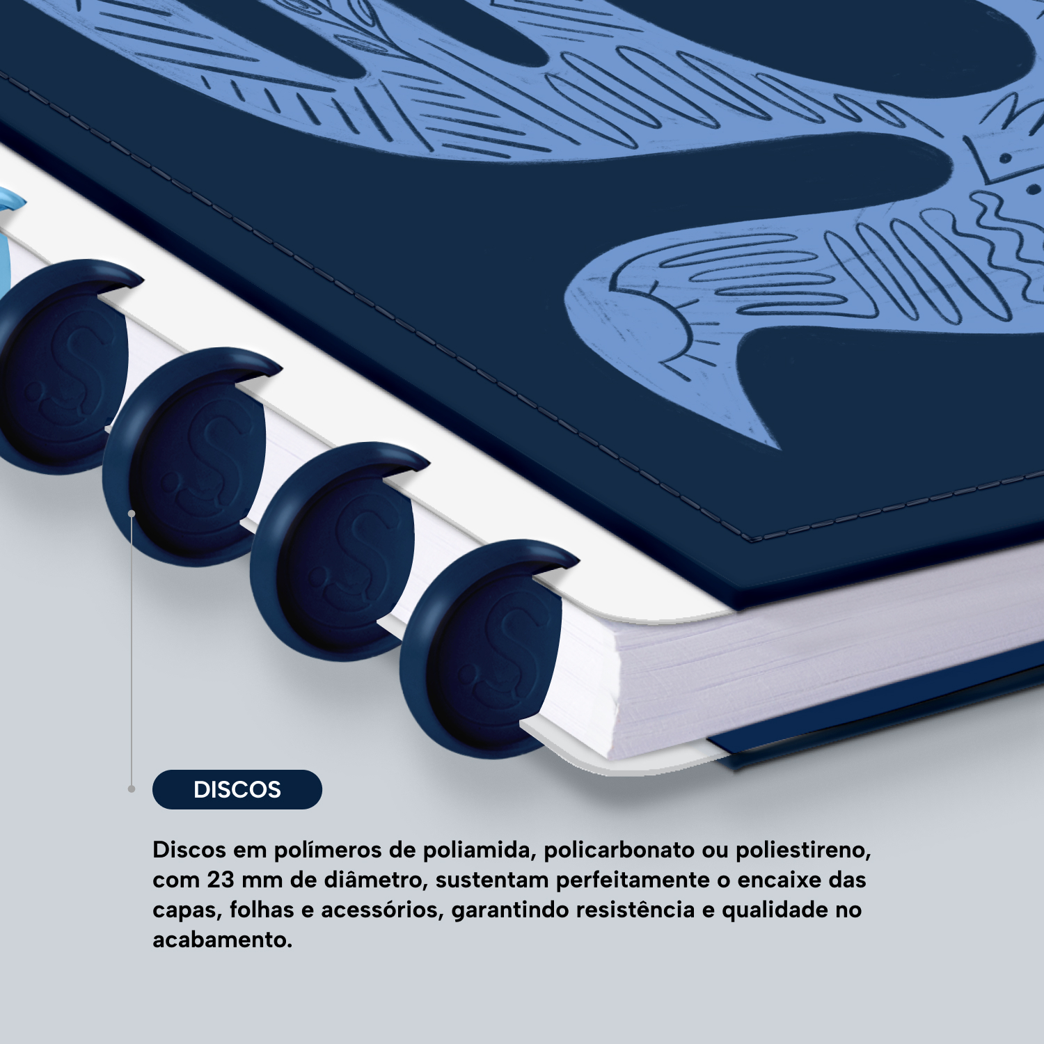 Encadernado com 11 discos M de 23mm em polímero de nylon e/ou policarbonato coloridos, fabricados no Brasil.