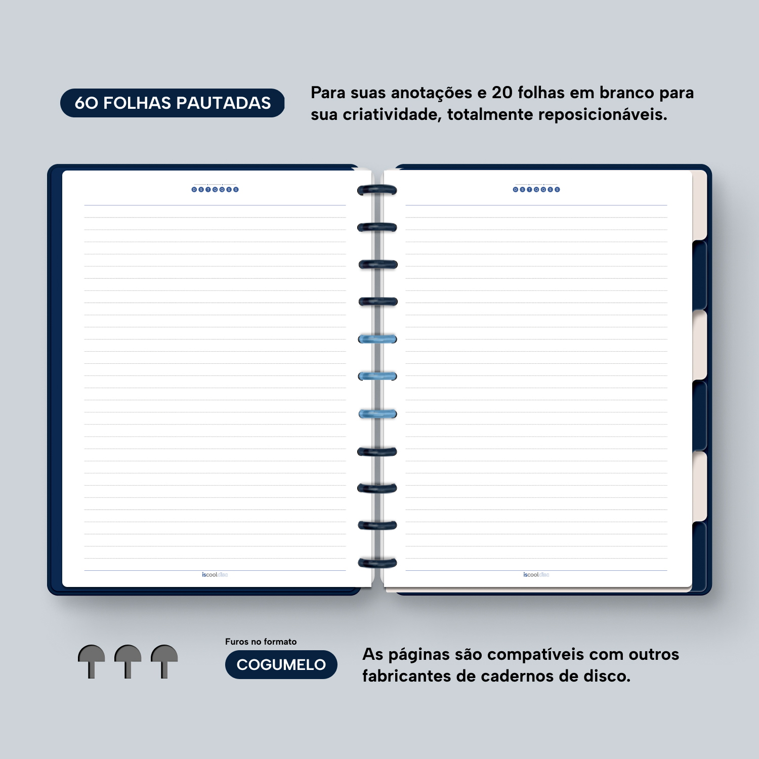 Além de tudo isso, o iscooldisc Prime conta com detalhes que fazem toda a diferença: elástico para fechamento da capa, muito mais estilo e privacidade para suas anotações; bolsa plástica para guardar seus rascunhos, referências, lembretes, documentos e uma cartela de adesivos incríveis, para que você possa personalizar seu caderno do seu jeitinho!