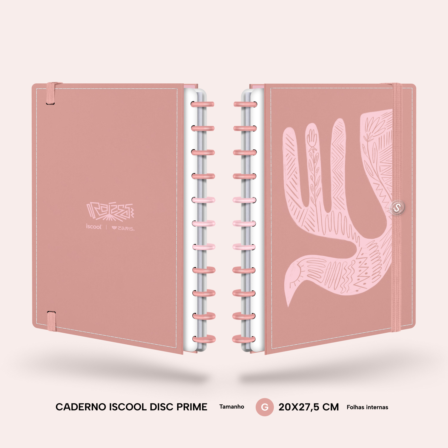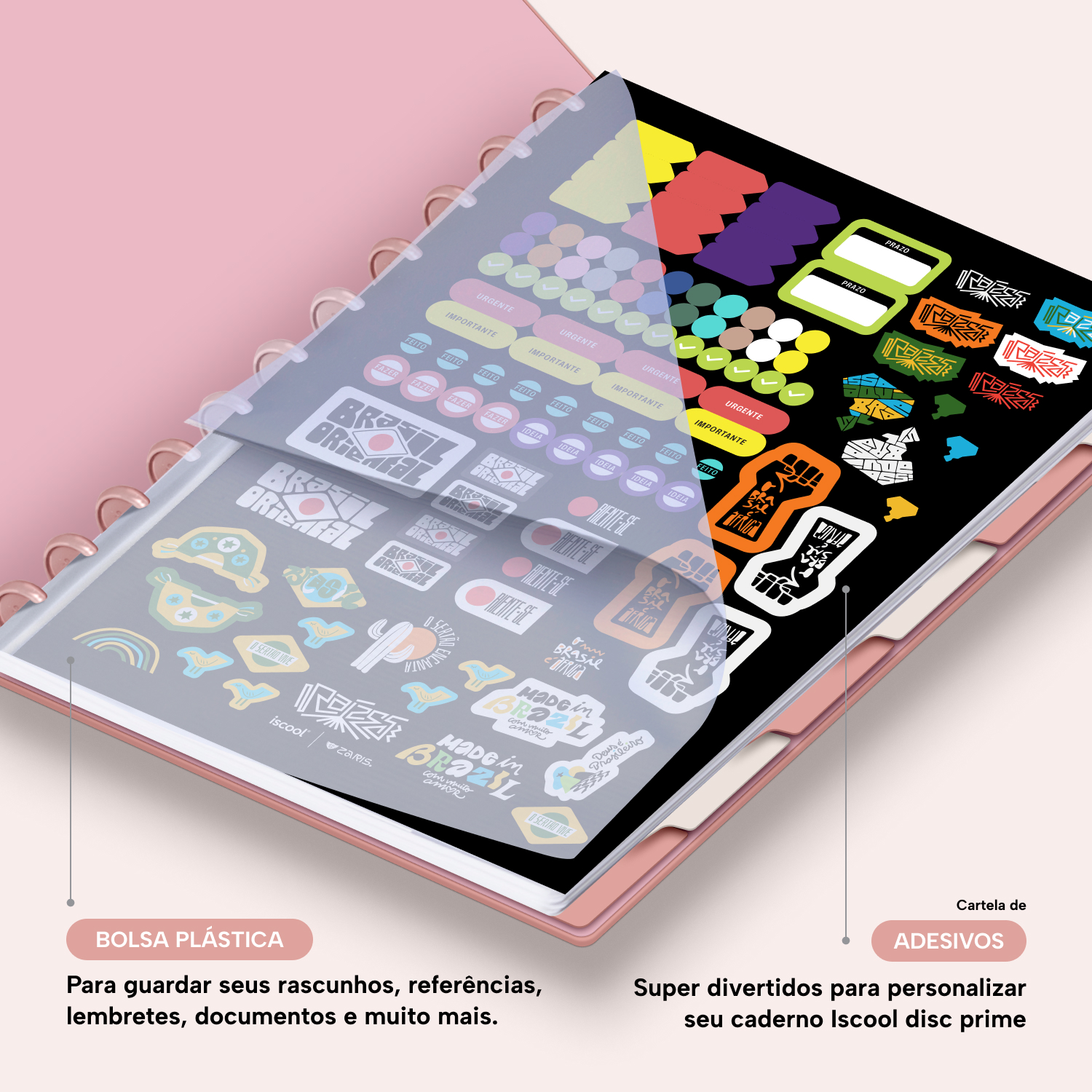 Além de tudo isso, o iscooldisc Prime conta com detalhes que fazem toda a diferença: elástico para fechamento da capa, muito mais estilo e privacidade para suas anotações; bolsa plástica para guardar seus rascunhos, referências, lembretes, documentos e uma cartela de adesivos incríveis, para que você possa personalizar seu caderno do seu jeitinho!