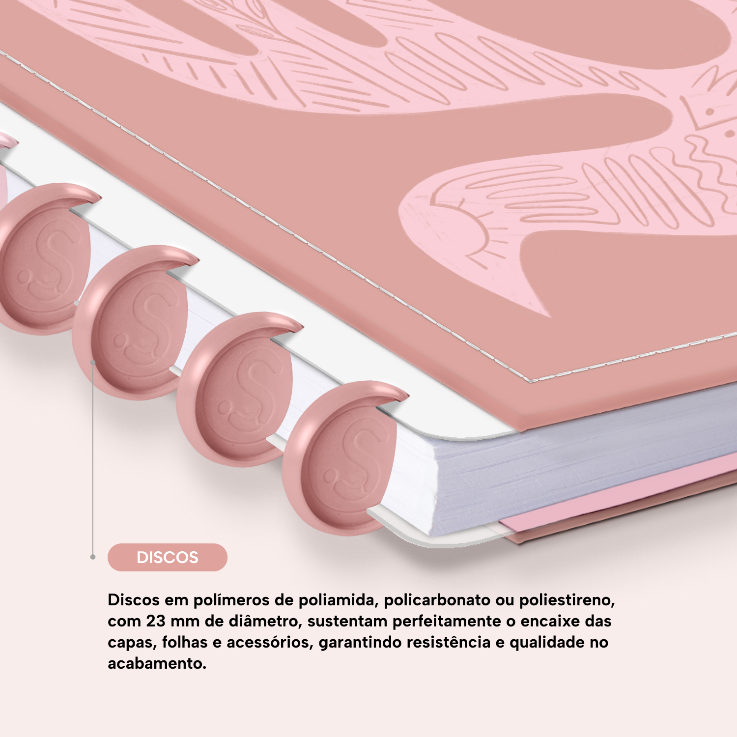 Encadernado com 11 discos M de 23mm em polímero de nylon e/ou policarbonato coloridos, fabricados no Brasil.