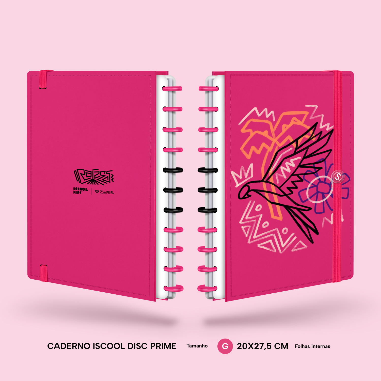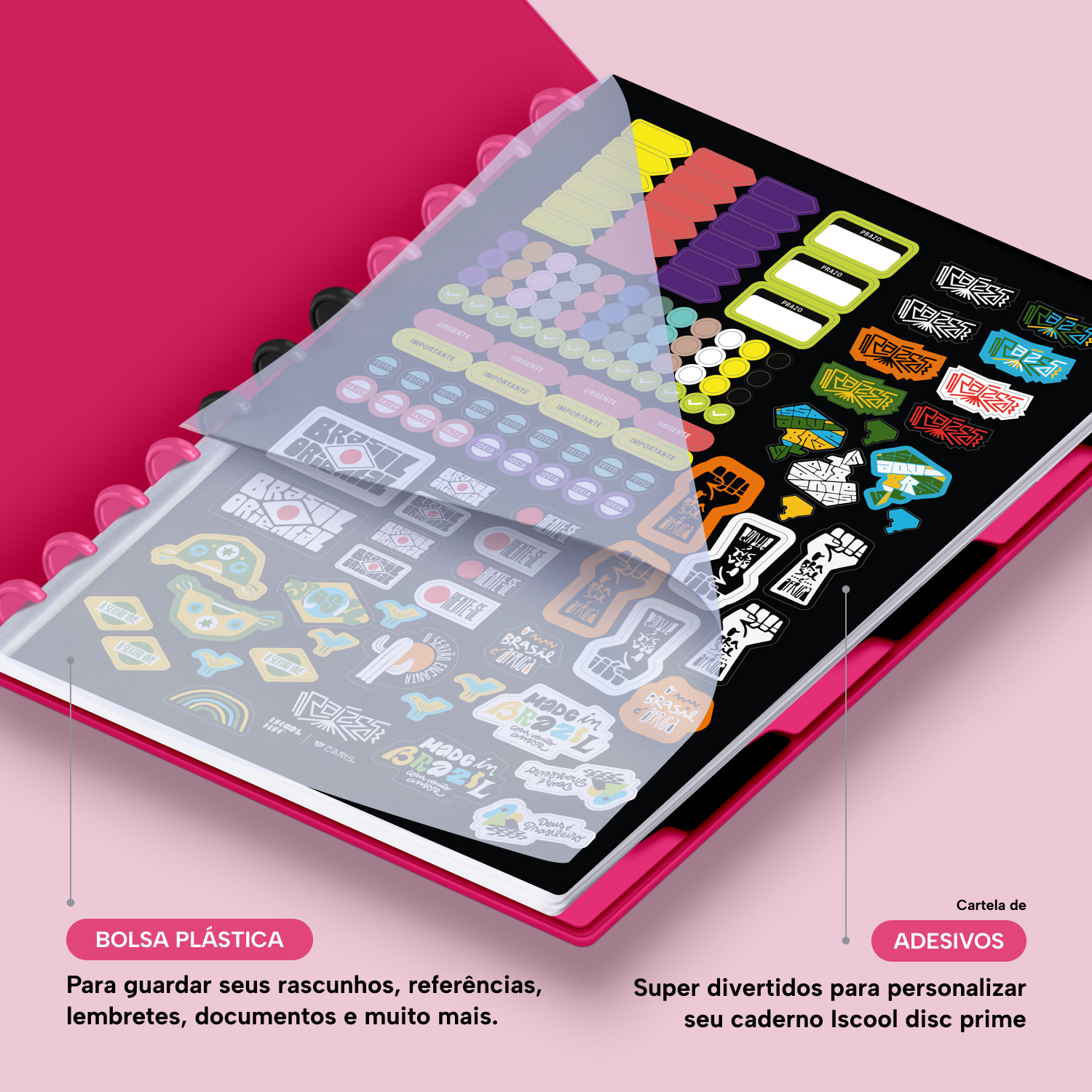 Além de tudo isso, o iscooldisc Prime conta com detalhes que fazem toda a diferença: elástico para fechamento da capa, muito mais estilo e privacidade para suas anotações; bolsa plástica para guardar seus rascunhos, referências, lembretes, documentos e uma cartela de adesivos incríveis, para que você possa personalizar seu caderno do seu jeitinho!