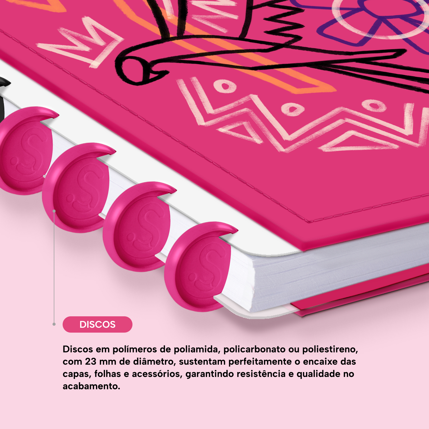 Encadernado com 11 discos M de 23mm em polímero de nylon e/ou policarbonato coloridos, fabricados no Brasil.