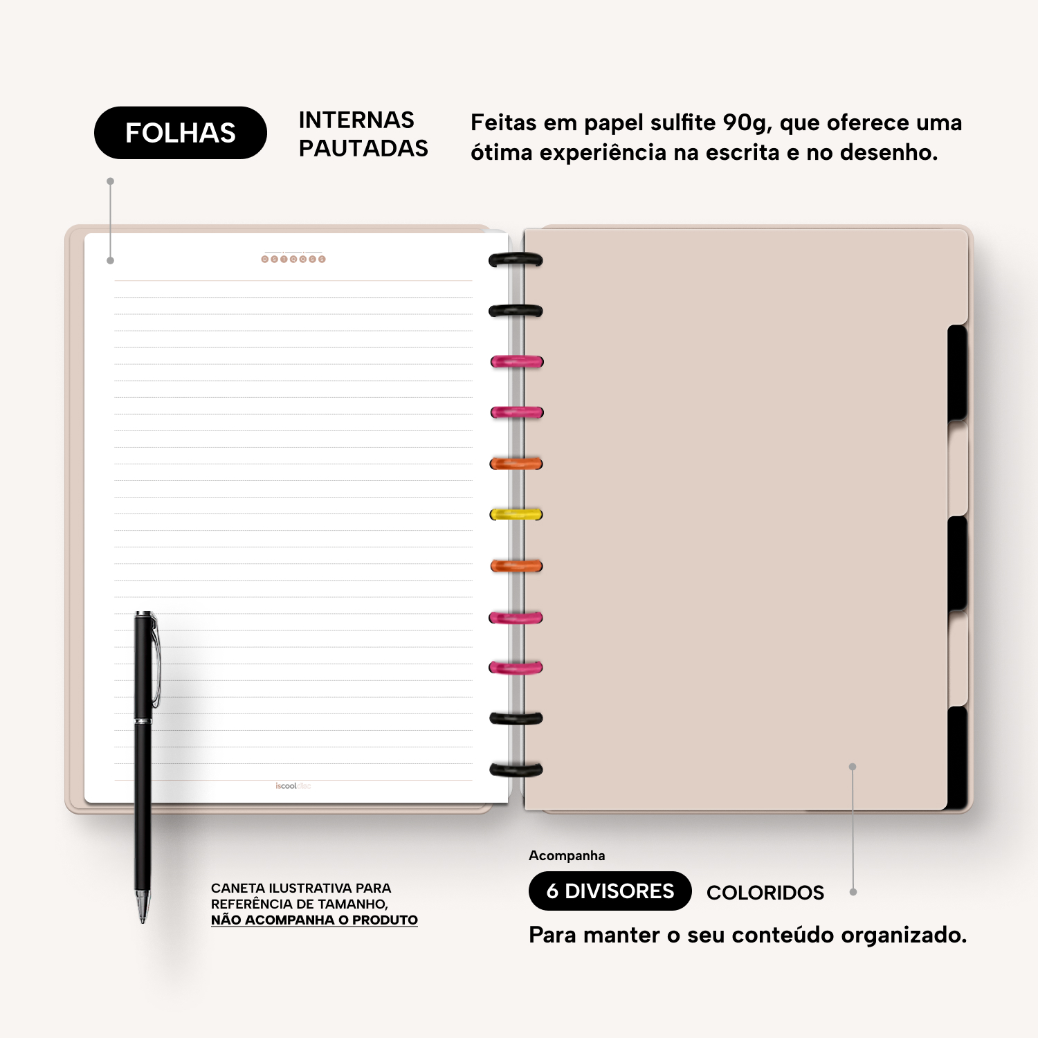 A capa é dura, com impressão digital de alta definição, e acompanha 6 lindas divisórias que você pode colocar em qualquer local do caderno, funcionando como o guia perfeito para sua organização.