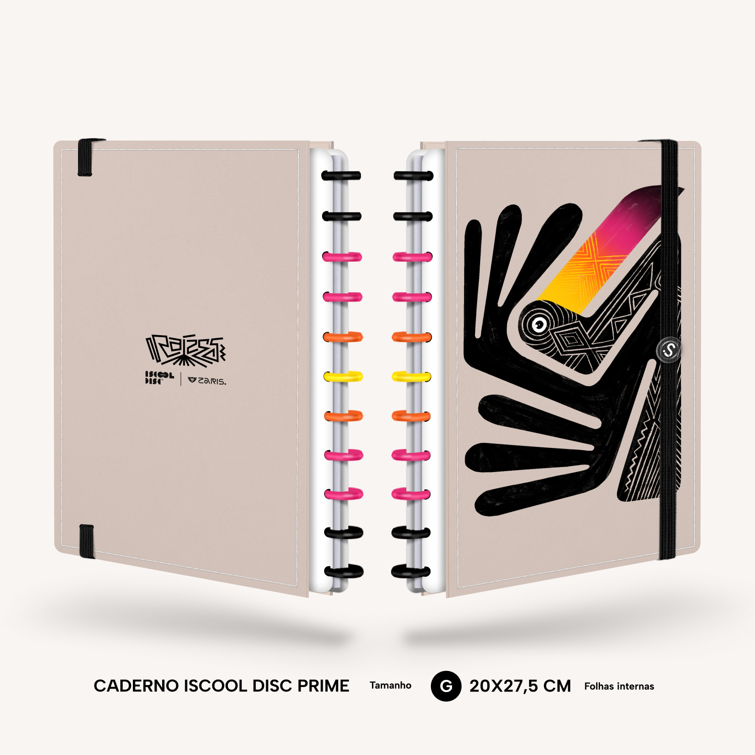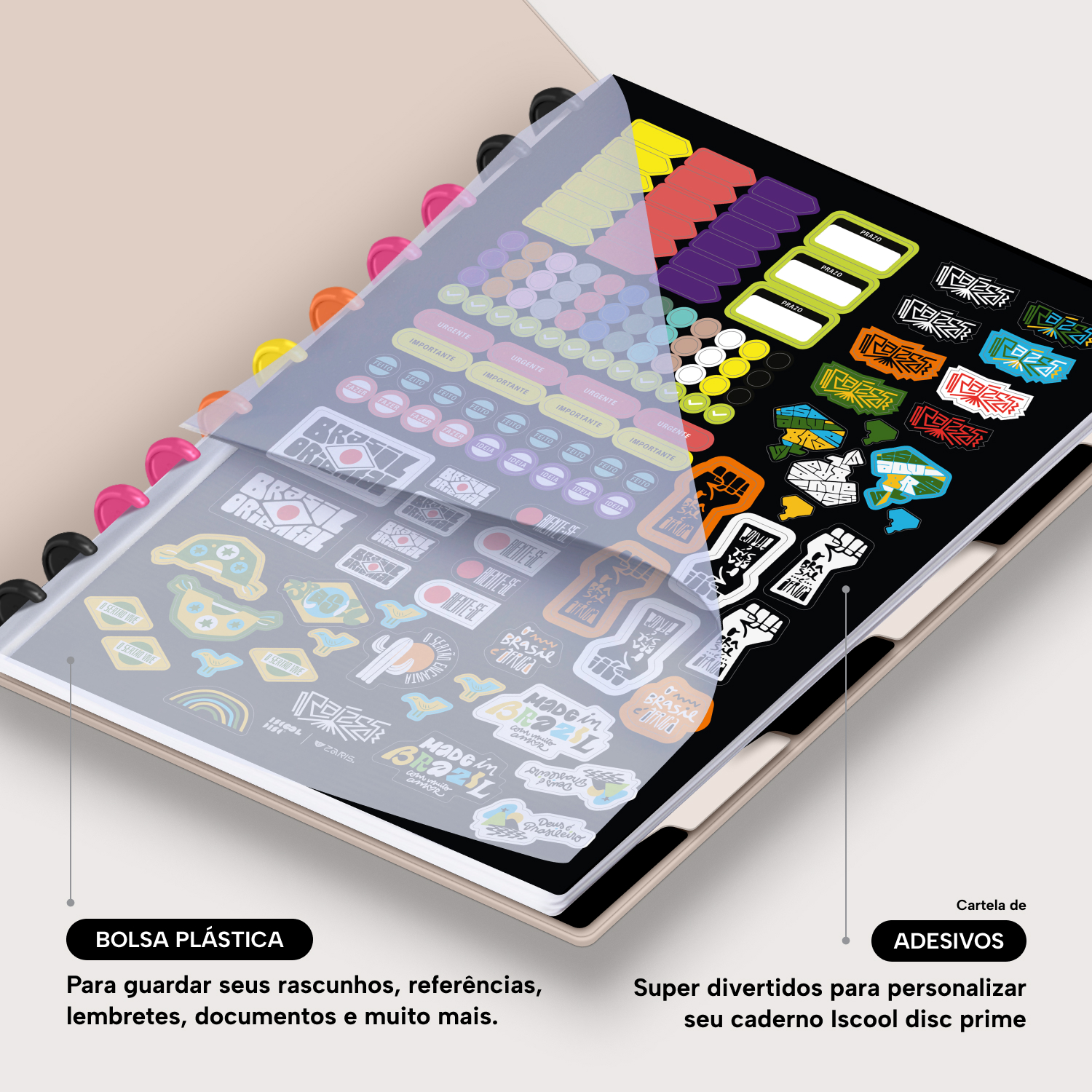 Além de tudo isso, o iscooldisc Prime conta com detalhes que fazem toda a diferença: elástico para fechamento da capa, muito mais estilo e privacidade para suas anotações; bolsa plástica para guardar seus rascunhos, referências, lembretes, documentos e uma cartela de adesivos incríveis, para que você possa personalizar seu caderno do seu jeitinho!