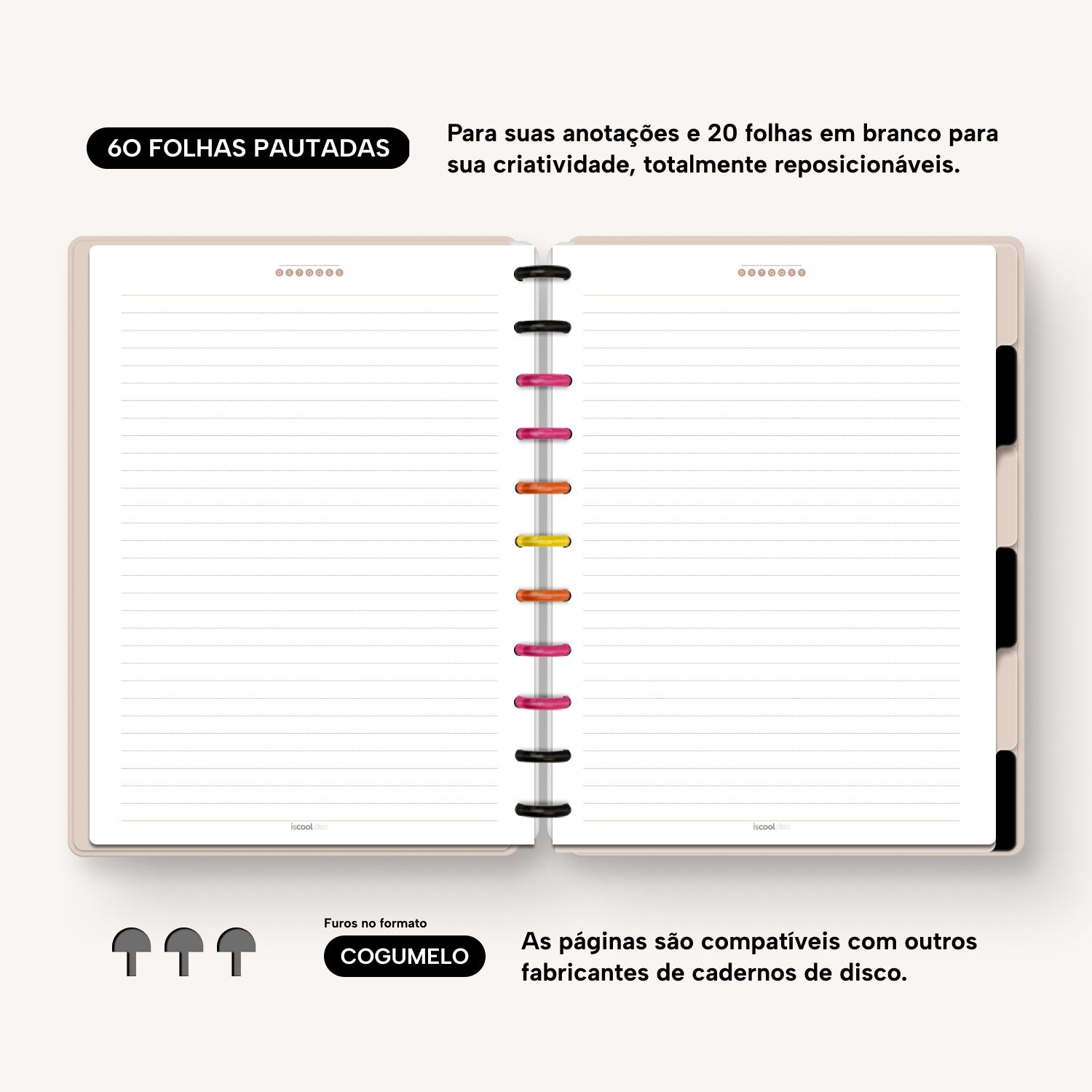 O miolo conta com 60 folhas pautadas decoradas em papel sulfite 90g (aquele papel mais “grossinho”) para que você use e abuse das suas canetas especiais, e 20 folhas em branco, ideais para explorar seu lado mais criativo ou até imprimir nelas.