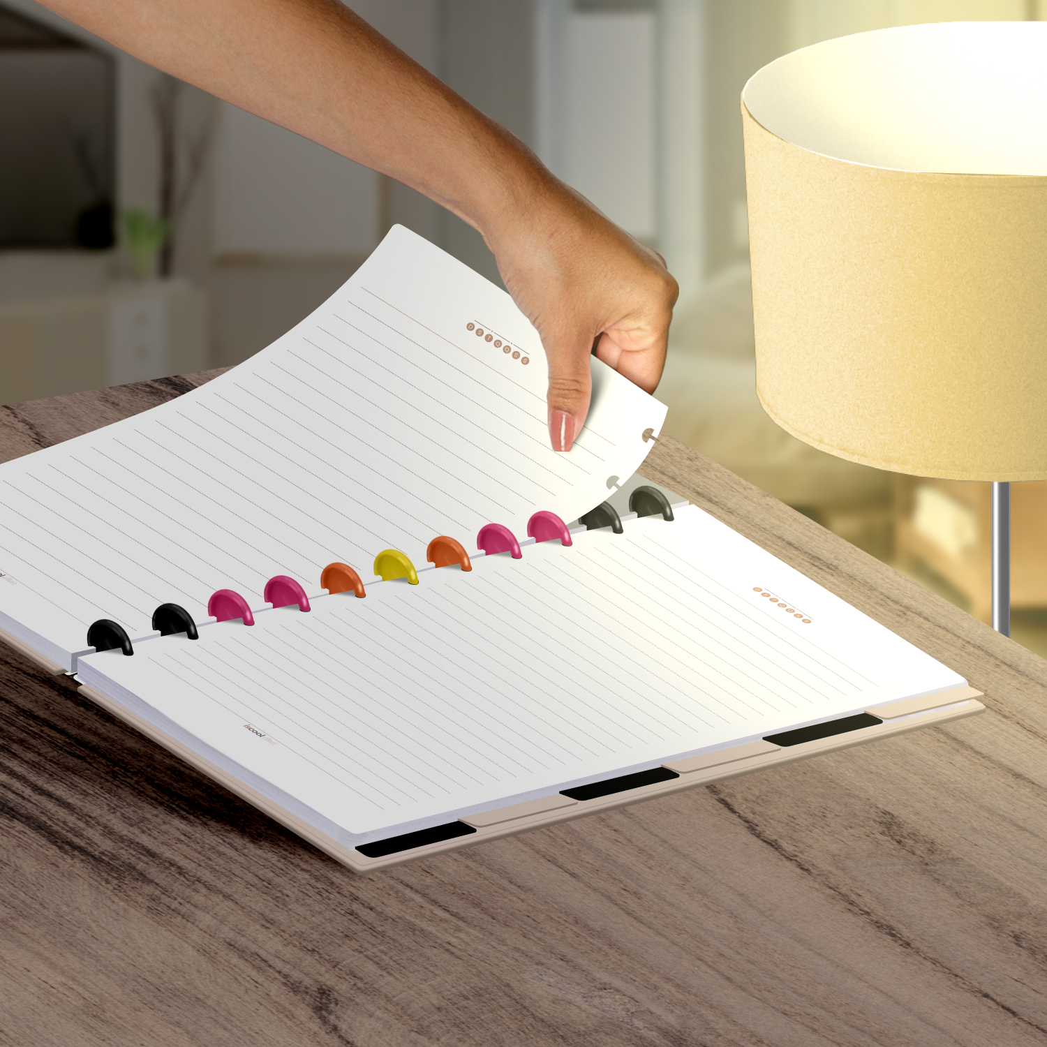 Encadernado com 11 discos M de 23mm em polímero de nylon e/ou policarbonato coloridos, fabricados no Brasil.