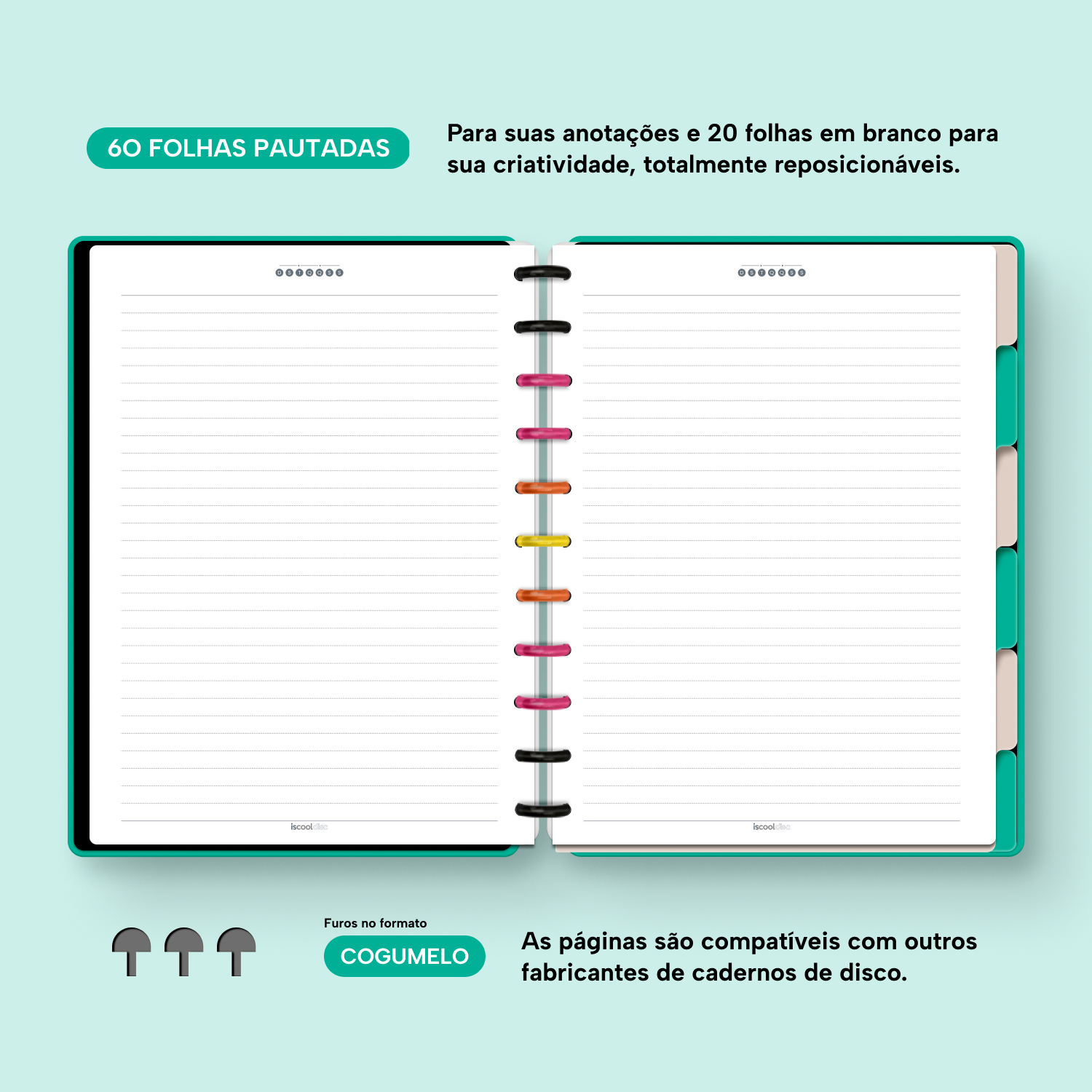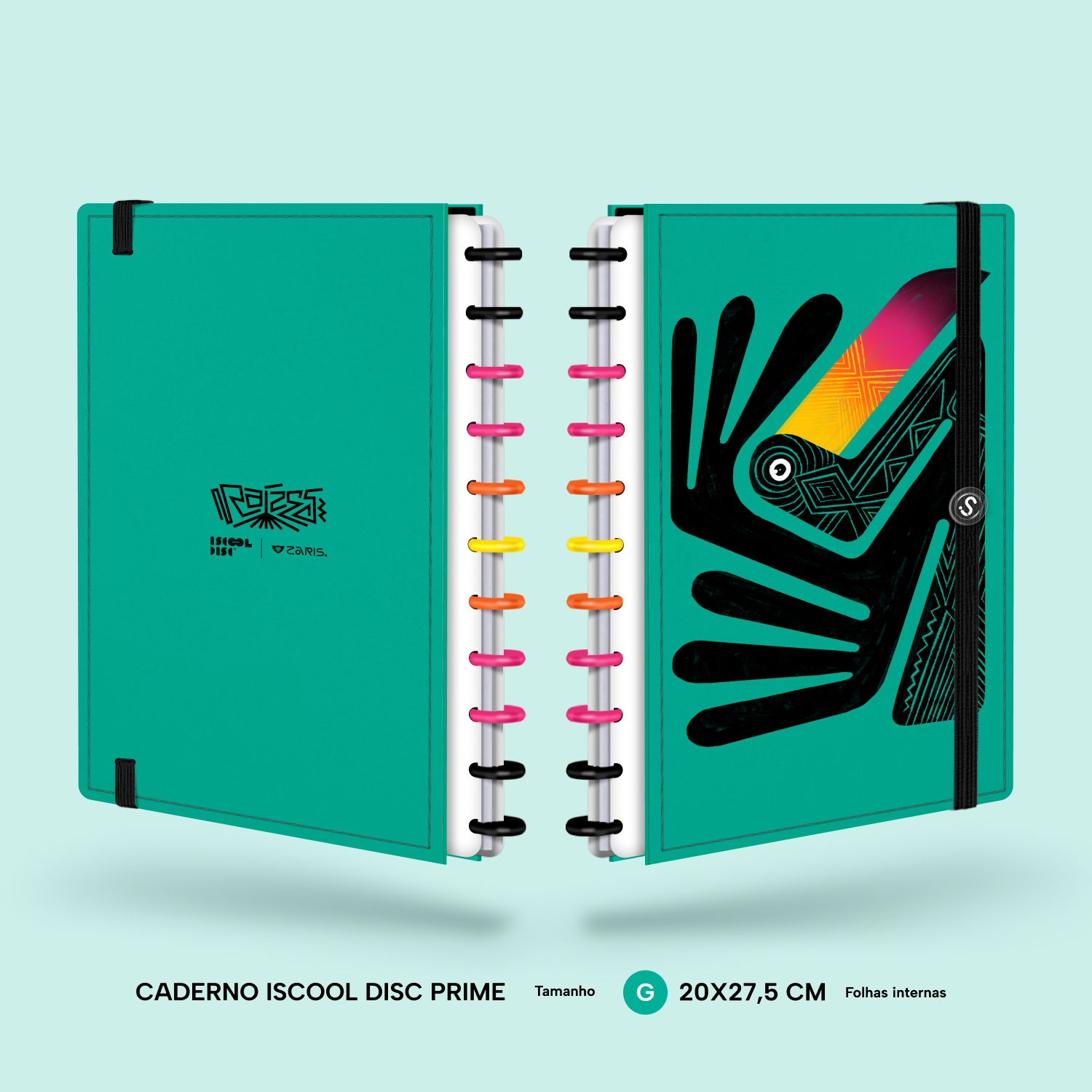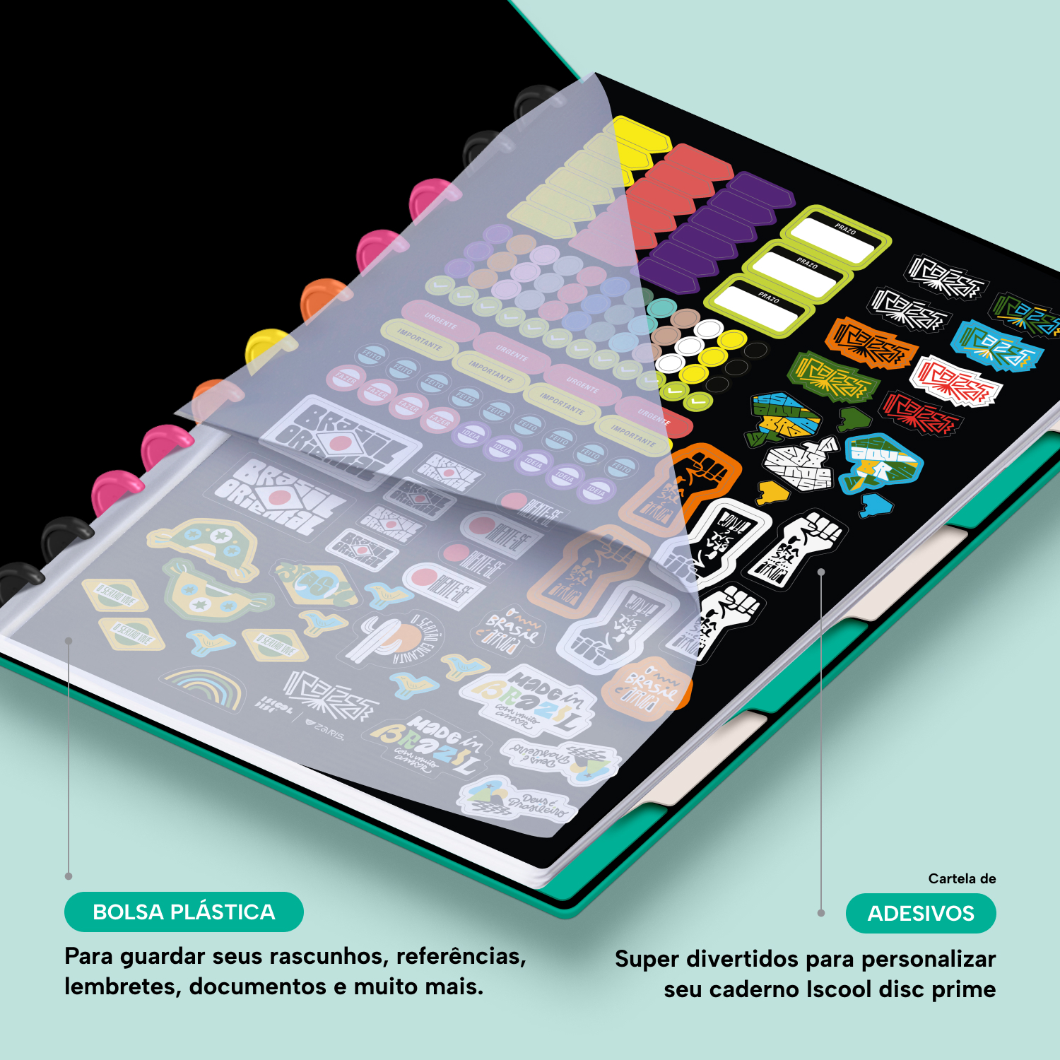 Além de tudo isso, o iscooldisc Prime conta com detalhes que fazem toda a diferença: elástico para fechamento da capa, muito mais estilo e privacidade para suas anotações; bolsa plástica para guardar seus rascunhos, referências, lembretes, documentos e uma cartela de adesivos incríveis, para que você possa personalizar seu caderno do seu jeitinho!