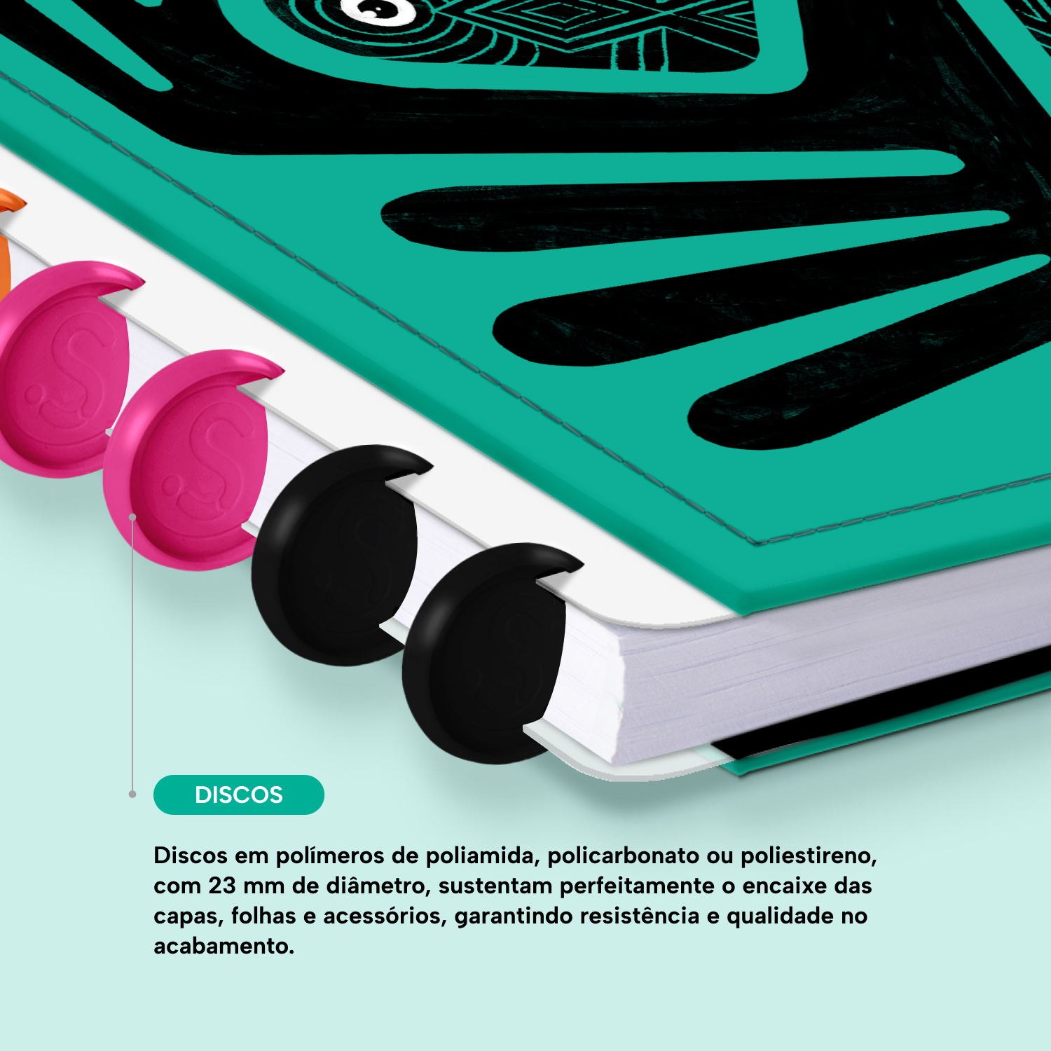 Encadernado com 11 discos M de 23mm em polímero de nylon e/ou policarbonato coloridos, fabricados no Brasil.