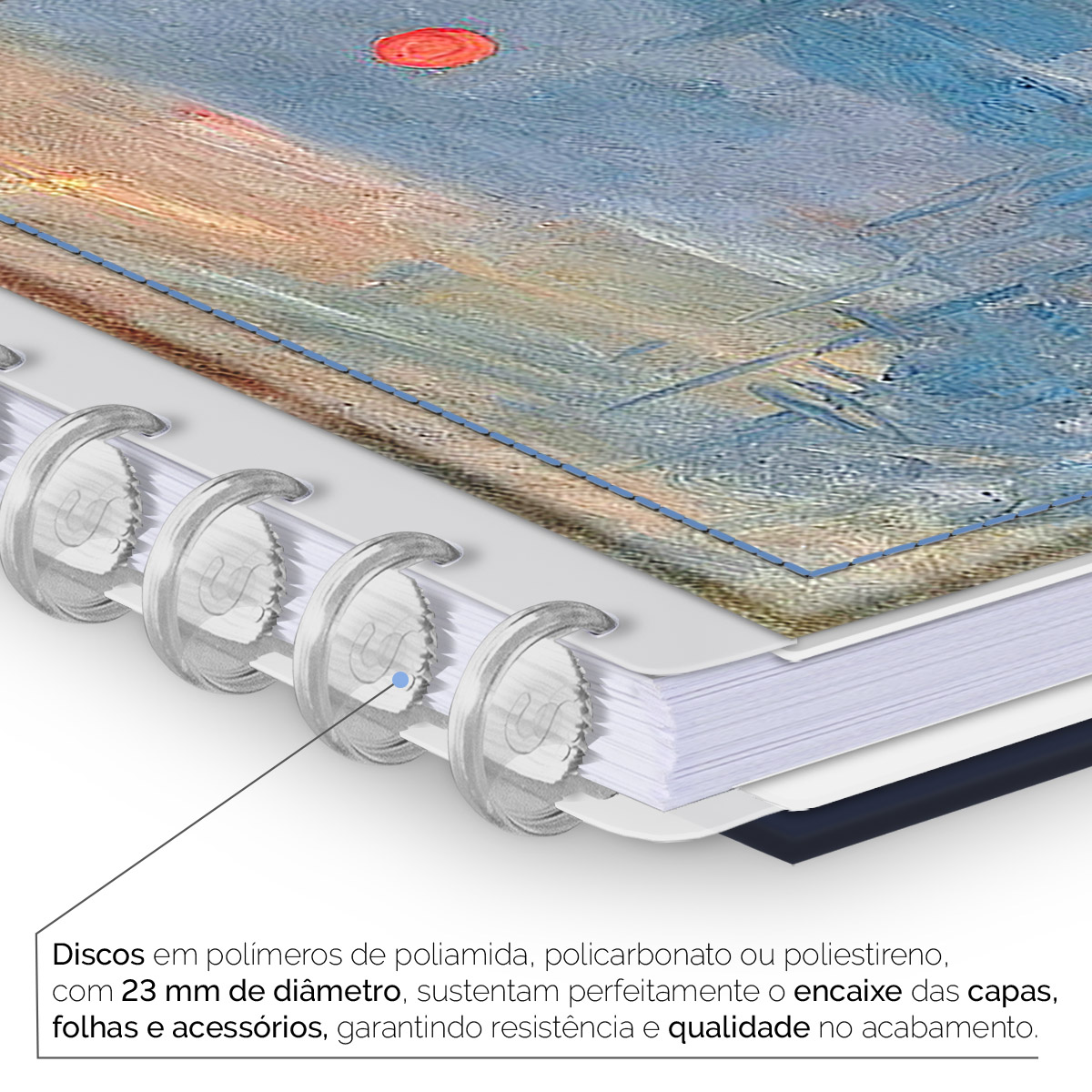 Encadernado com 8 discos M de 23mm em polímero de nylon e/ou policarbonato coloridos, fabricados no Brasil.