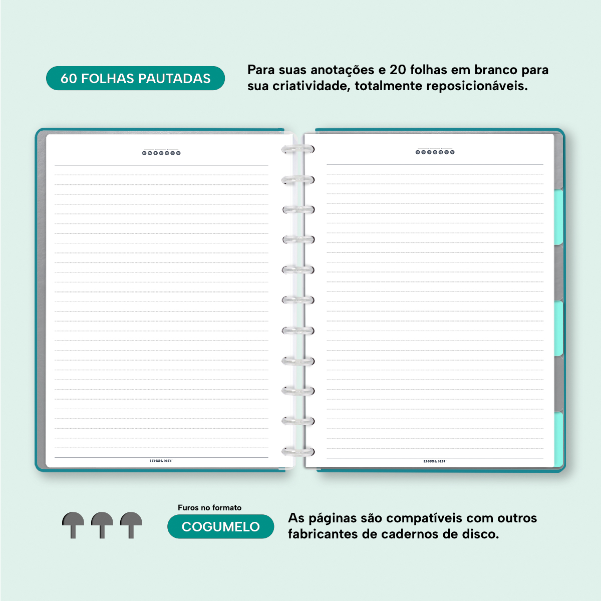 Com furos no formato de “cogumelo”, você poderá dar um “up” em seu caderno com nossos refis, além de ser compatível com outros fabricantes de cadernos de discos.