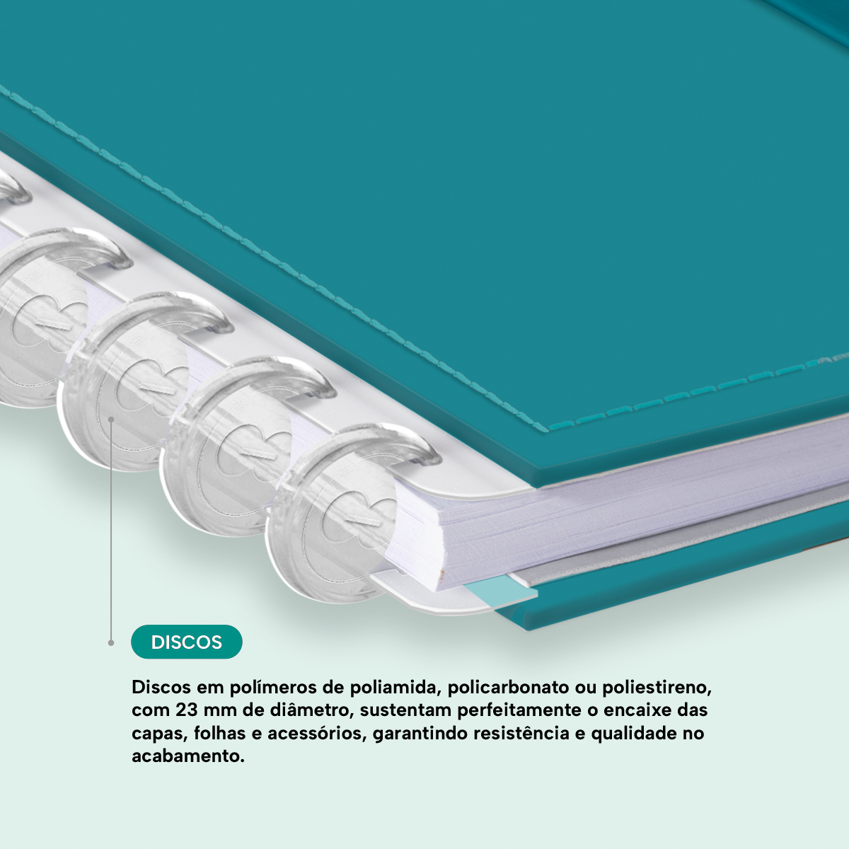 Encadernado com 11 discos M de 23mm em polímero de nylon e/ou policarbonato coloridos, fabricados no Brasil.