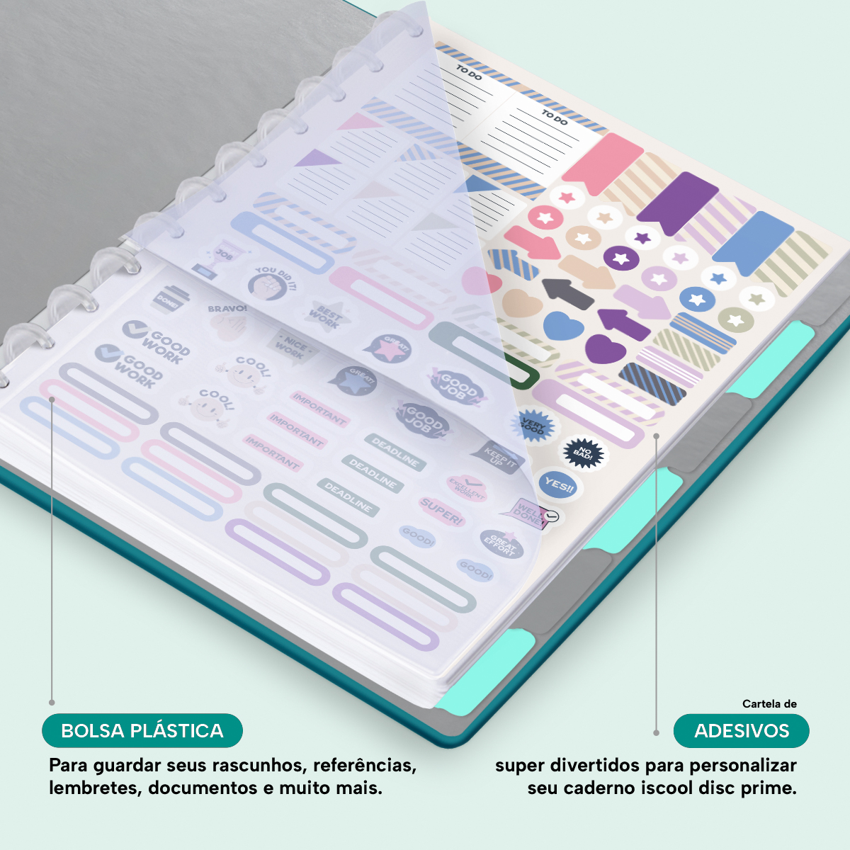 Além de tudo isso, o Iscool Disc Prime, conta com detalhezinhos que fazem toda diferença: elástico para fechamento da capa, muito mais estilo e privacidade para suas anotações; bolsa plástica para guardar seus rascunhos, referências, lembretes, documentos e uma cartela de adesivos incríveis, para que você possa personalizar seu caderno do seu jeitinho!