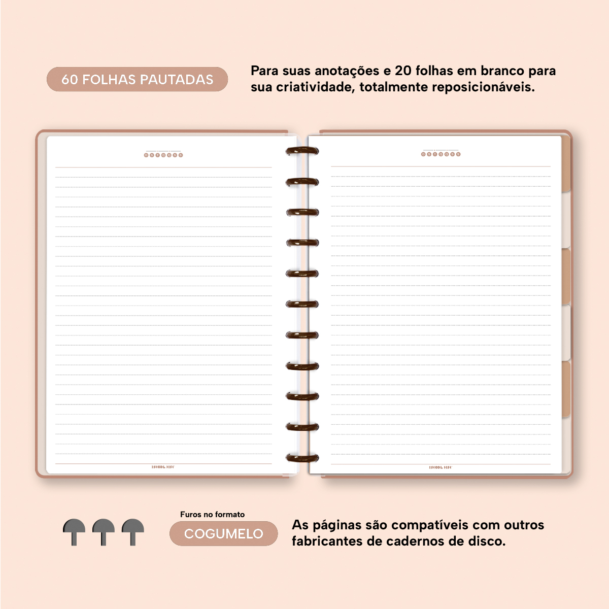 Com furos no formato de “cogumelo”, você poderá dar um “up” em seu caderno com nossos refis, além de ser compatível com outros fabricantes de cadernos de discos.