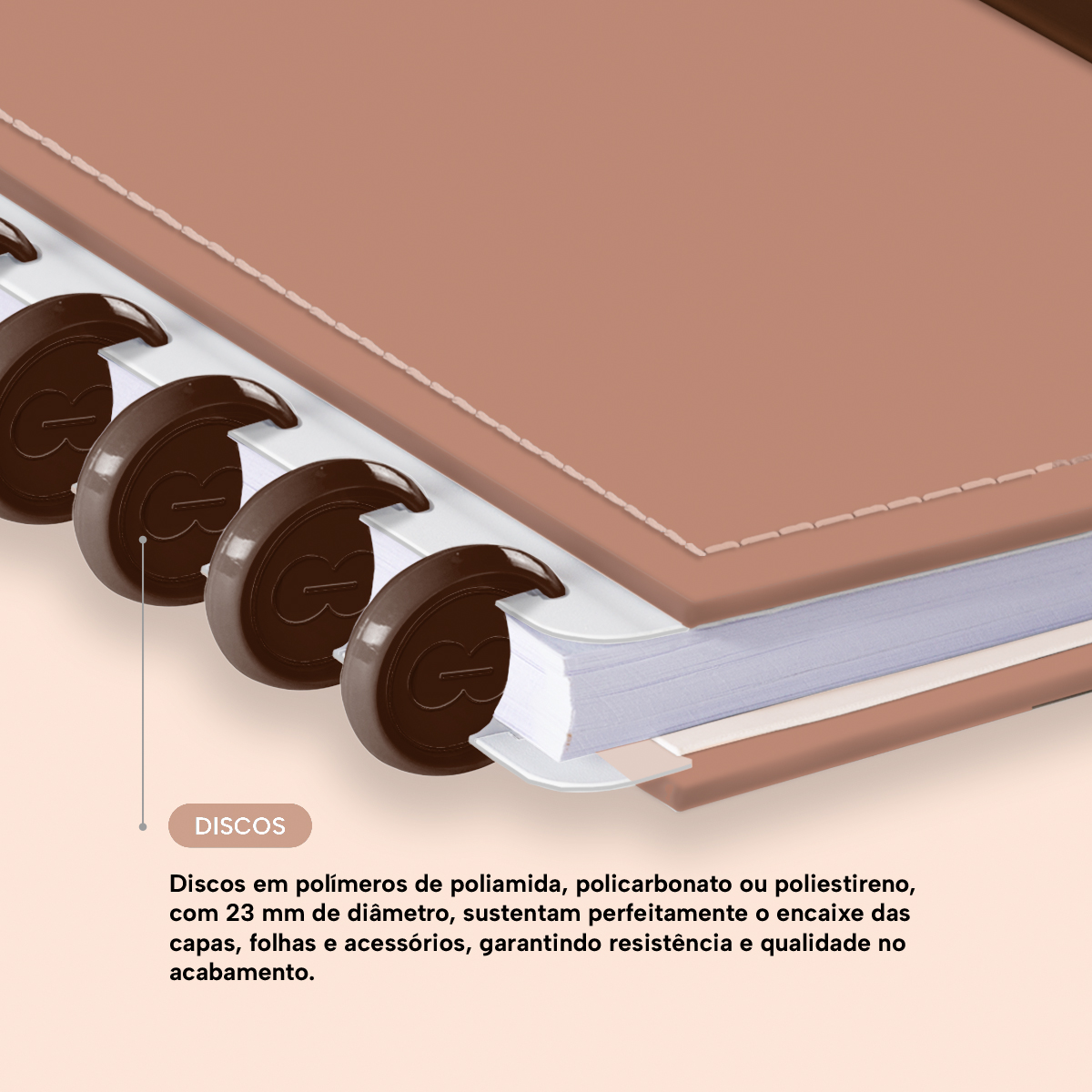 Encadernado com 11 discos M de 23mm em polímero de nylon e/ou policarbonato coloridos, fabricados no Brasil.