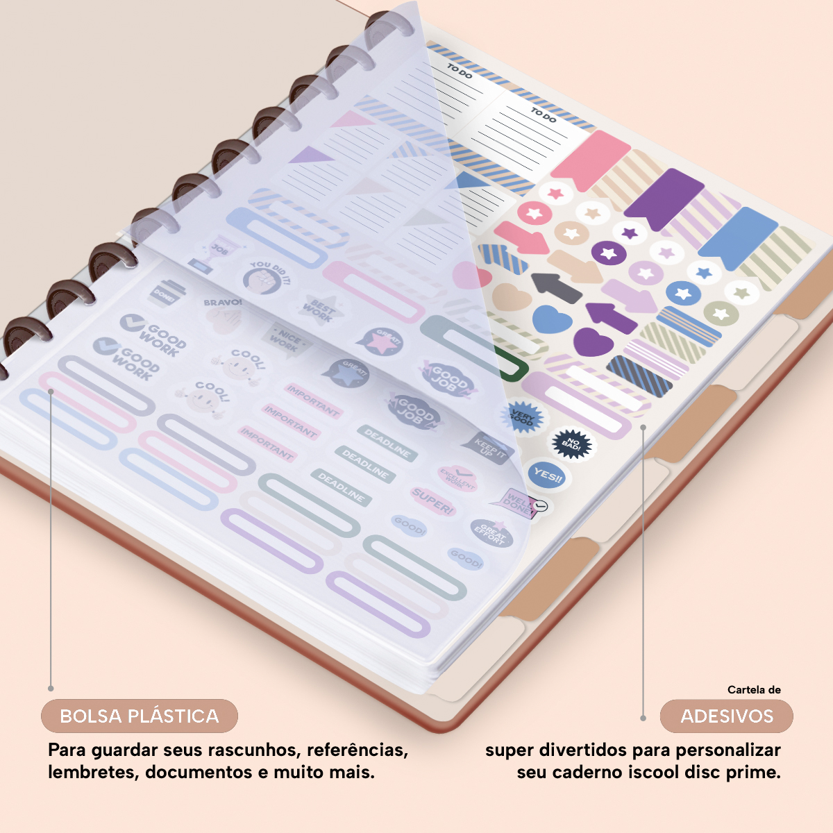 Além de tudo isso, o Iscool Disc Prime, conta com detalhezinhos que fazem toda diferença: elástico para fechamento da capa, muito mais estilo e privacidade para suas anotações; bolsa plástica para guardar seus rascunhos, referências, lembretes, documentos e uma cartela de adesivos incríveis, para que você possa personalizar seu caderno do seu jeitinho!
