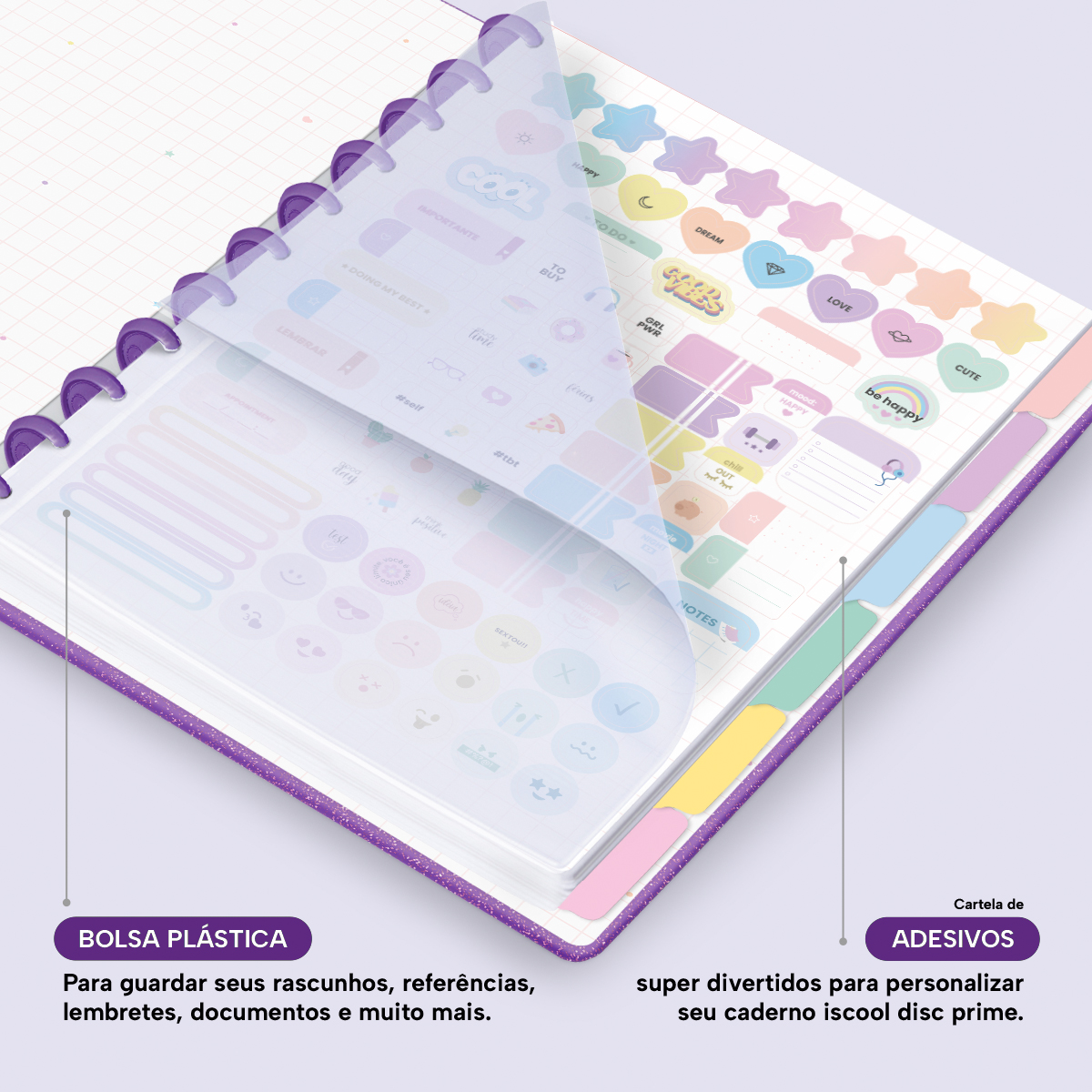 Além de tudo isso, o Iscool Disc Prime, conta com detalhezinhos que fazem toda diferença: elástico para fechamento da capa, muito mais estilo e privacidade para suas anotações; bolsa plástica para guardar seus rascunhos, referências, lembretes, documentos e uma cartela de adesivos incríveis, para que você possa personalizar seu caderno do seu jeitinho!