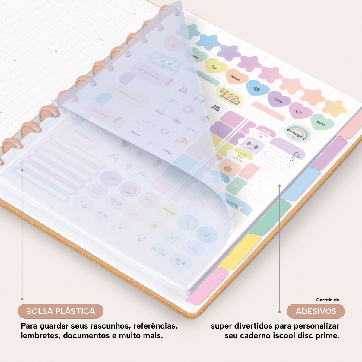 Além de tudo isso, o Iscool Disc Prime, conta com detalhezinhos que fazem toda diferença: elástico para fechamento da capa, muito mais estilo e privacidade para suas anotações; bolsa plástica para guardar seus rascunhos, referências, lembretes, documentos e uma cartela de adesivos incríveis, para que você possa personalizar seu caderno do seu jeitinho!