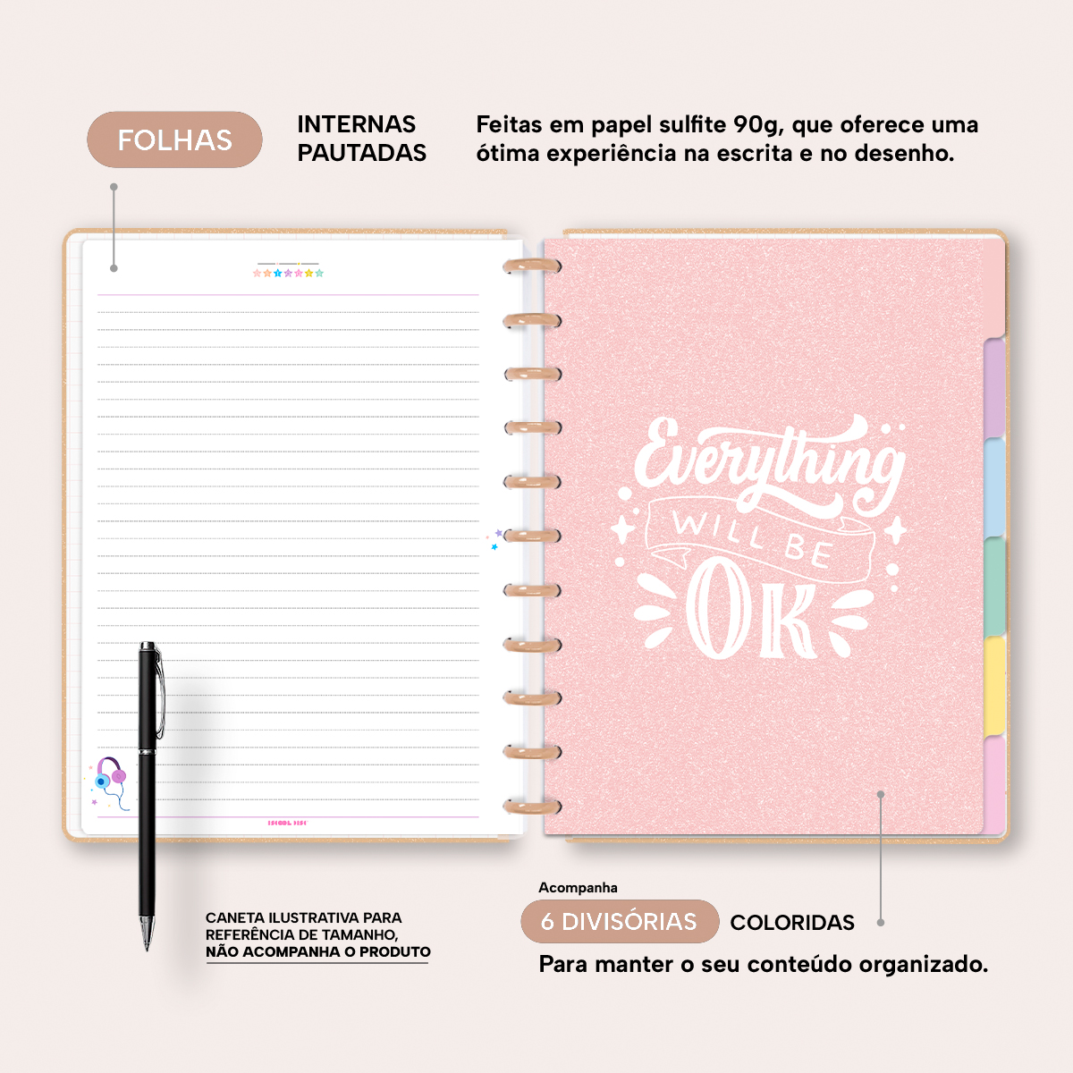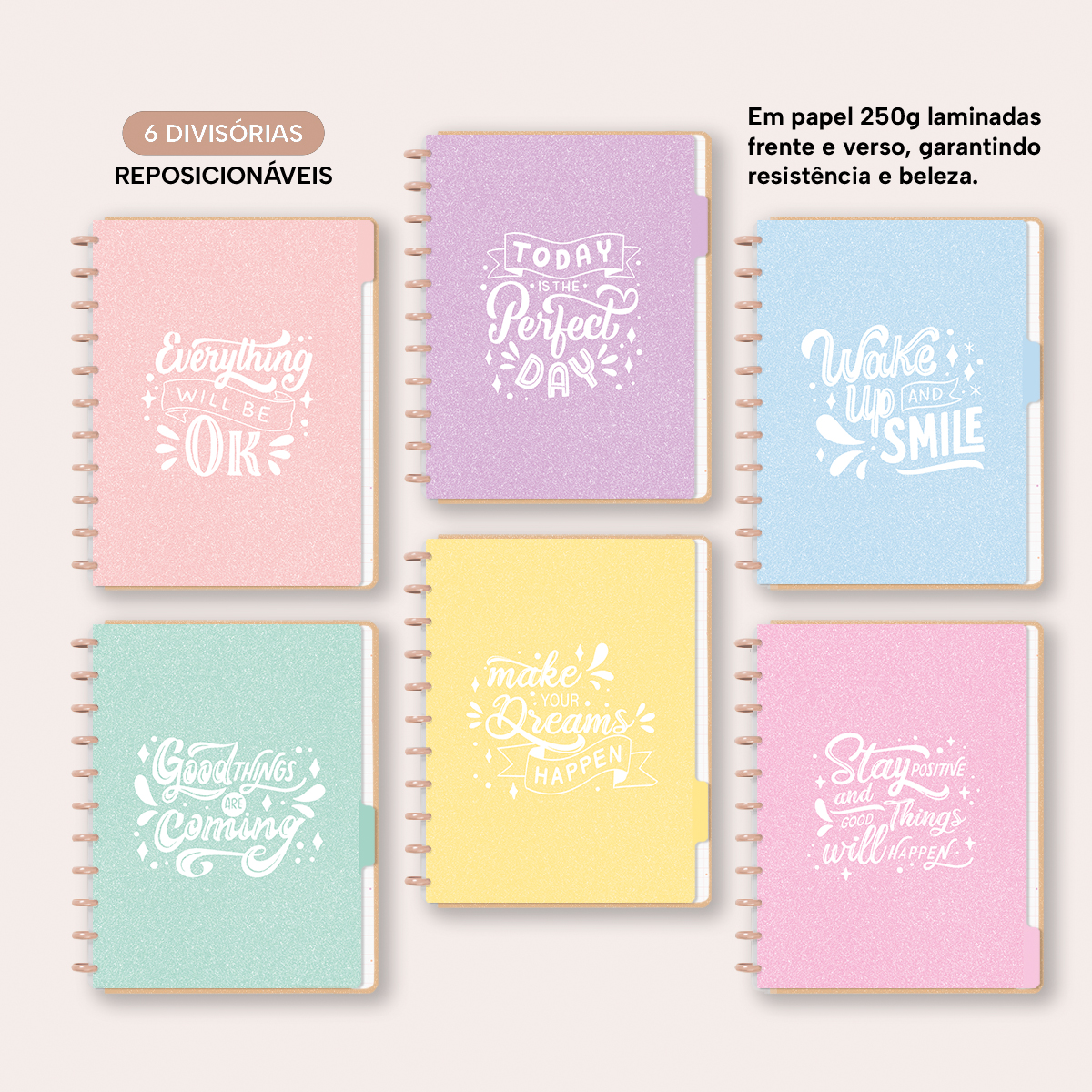 A capa é dura com impressão digital de alta definição, acompanha 6 lindas divisórias que você pode colocar em qualquer local do caderno, funcionando como o guia perfeito para sua organização.