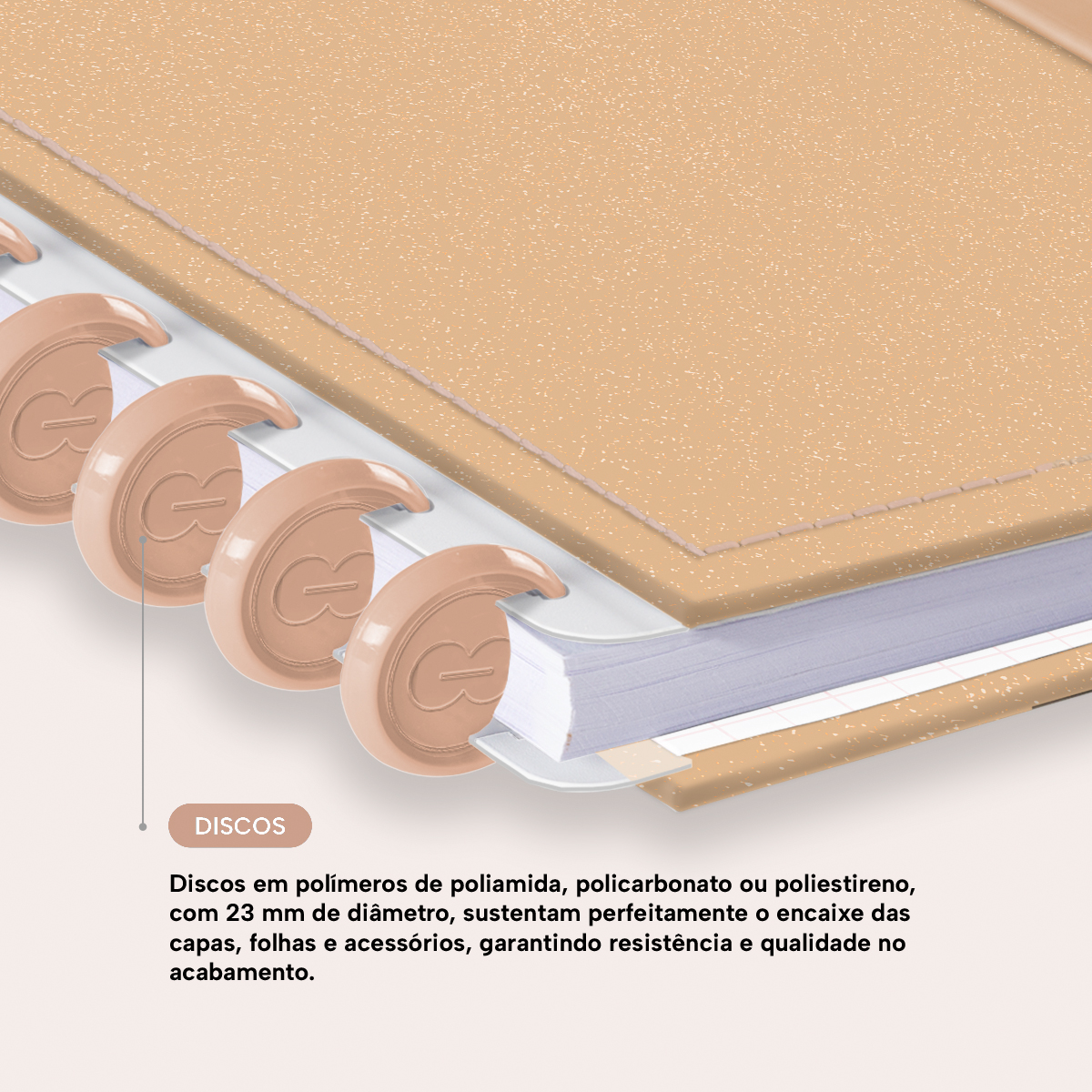 Encadernado com 11 discos M de 23mm em polímero de nylon e/ou policarbonato coloridos, fabricados no Brasil.