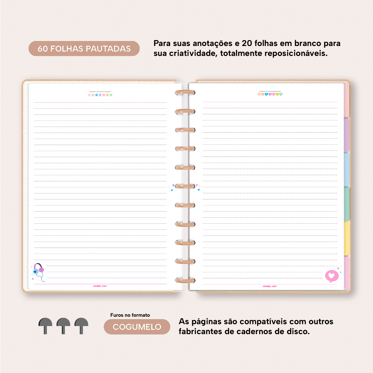 O miolo conta com 60 folhas pautadas decoradas em papel sulfite 90g, (aquele papel mais “grossinho”) para que você use e abuse das suas canetas especiais e 20 folhas em branco, ideais para explorar seu lado mais criativo ou até imprimir nelas.