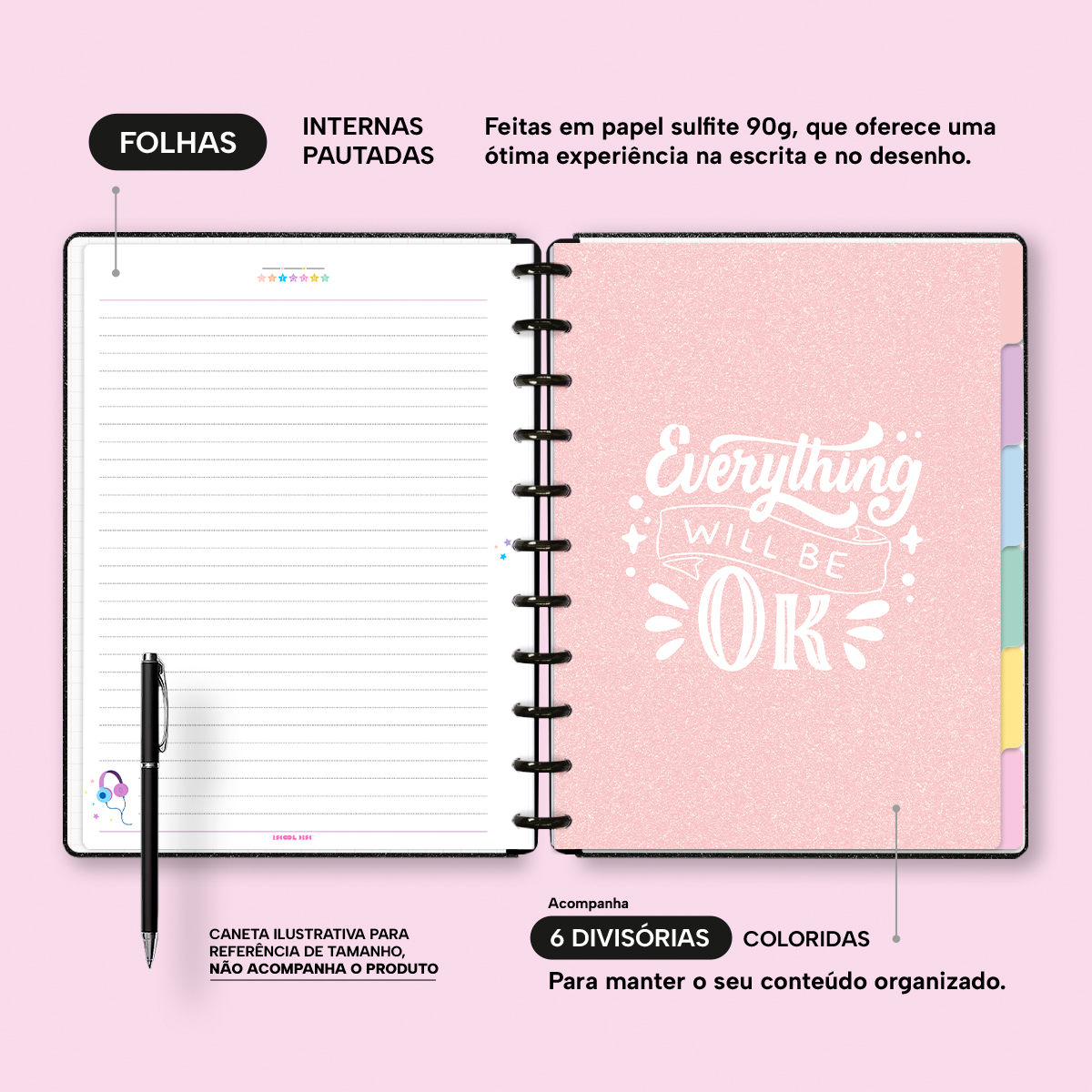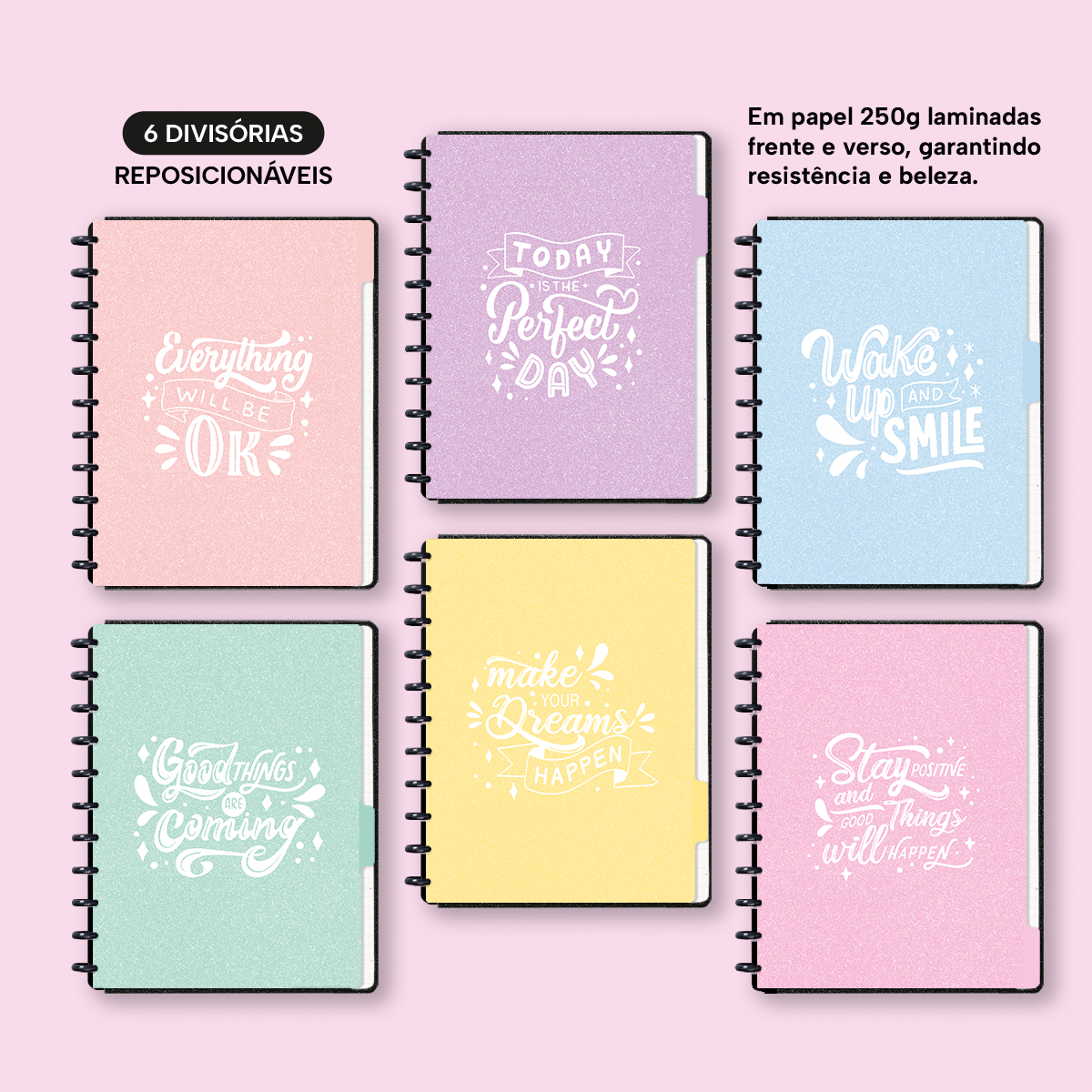 A capa é dura com impressão digital de alta definição, acompanha 6 lindas divisórias que você pode colocar em qualquer local do caderno, funcionando como o guia perfeito para sua organização.