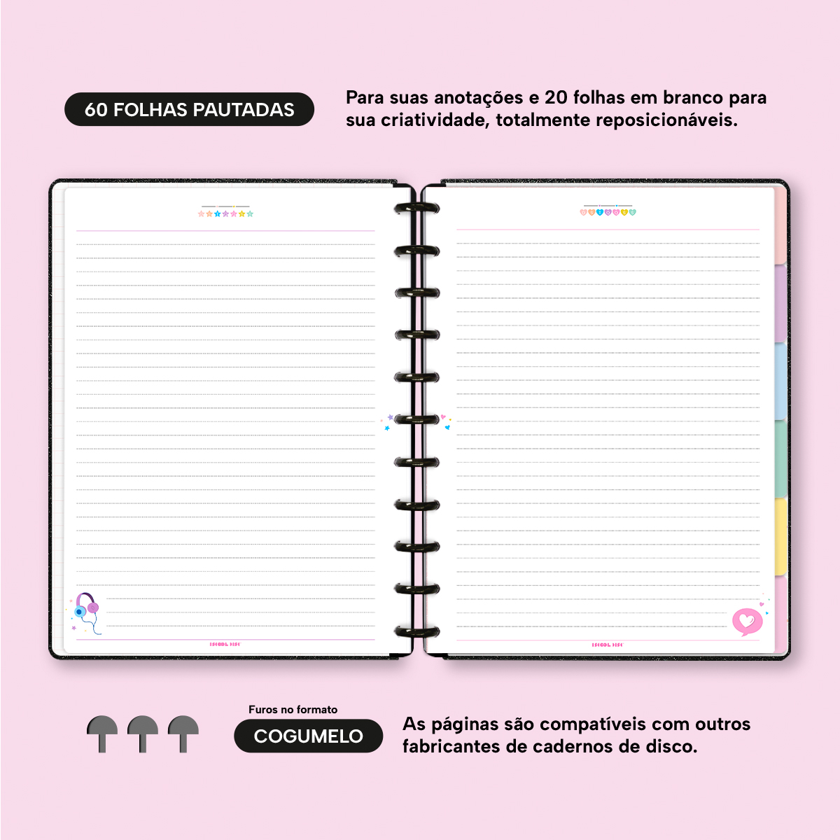O miolo conta com 60 folhas pautadas decoradas em papel sulfite 90g, (aquele papel mais “grossinho”) para que você use e abuse das suas canetas especiais e 20 folhas em branco, ideais para explorar seu lado mais criativo ou até imprimir nelas.