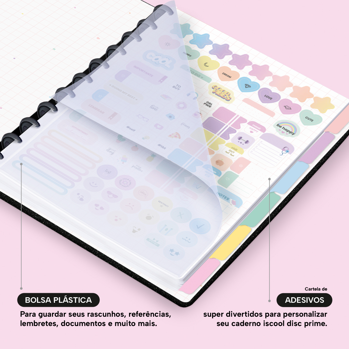 Além de tudo isso, o Iscool Disc Prime, conta com detalhezinhos que fazem toda diferença: elástico para fechamento da capa, muito mais estilo e privacidade para suas anotações; bolsa plástica para guardar seus rascunhos, referências, lembretes, documentos e uma cartela de adesivos incríveis, para que você possa personalizar seu caderno do seu jeitinho!