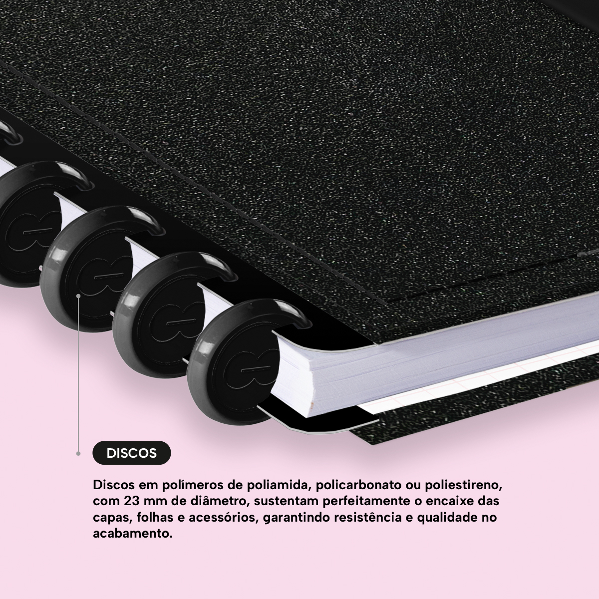 Encadernado com 11 discos M de 23mm em polímero de nylon e/ou policarbonato coloridos, fabricados no Brasil.