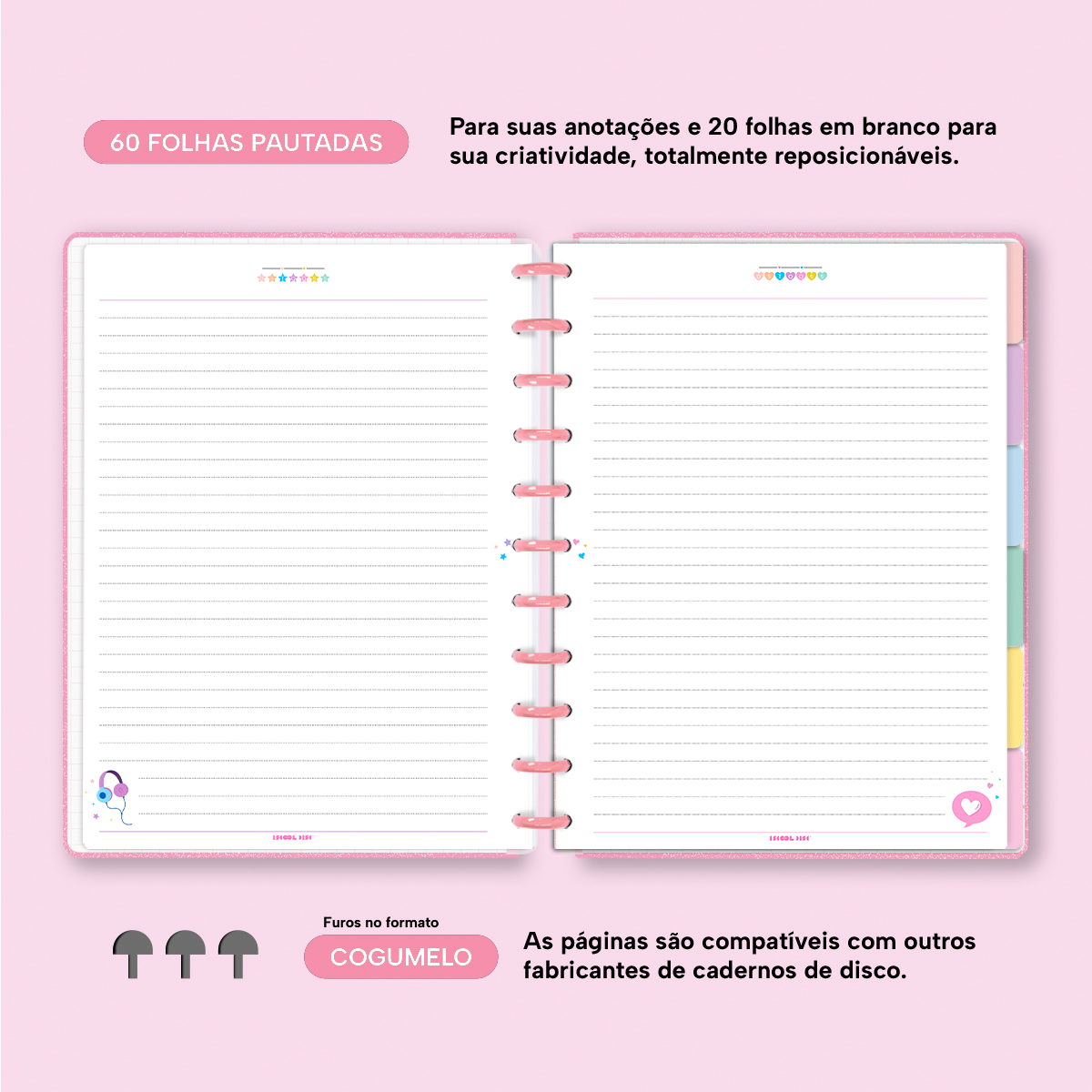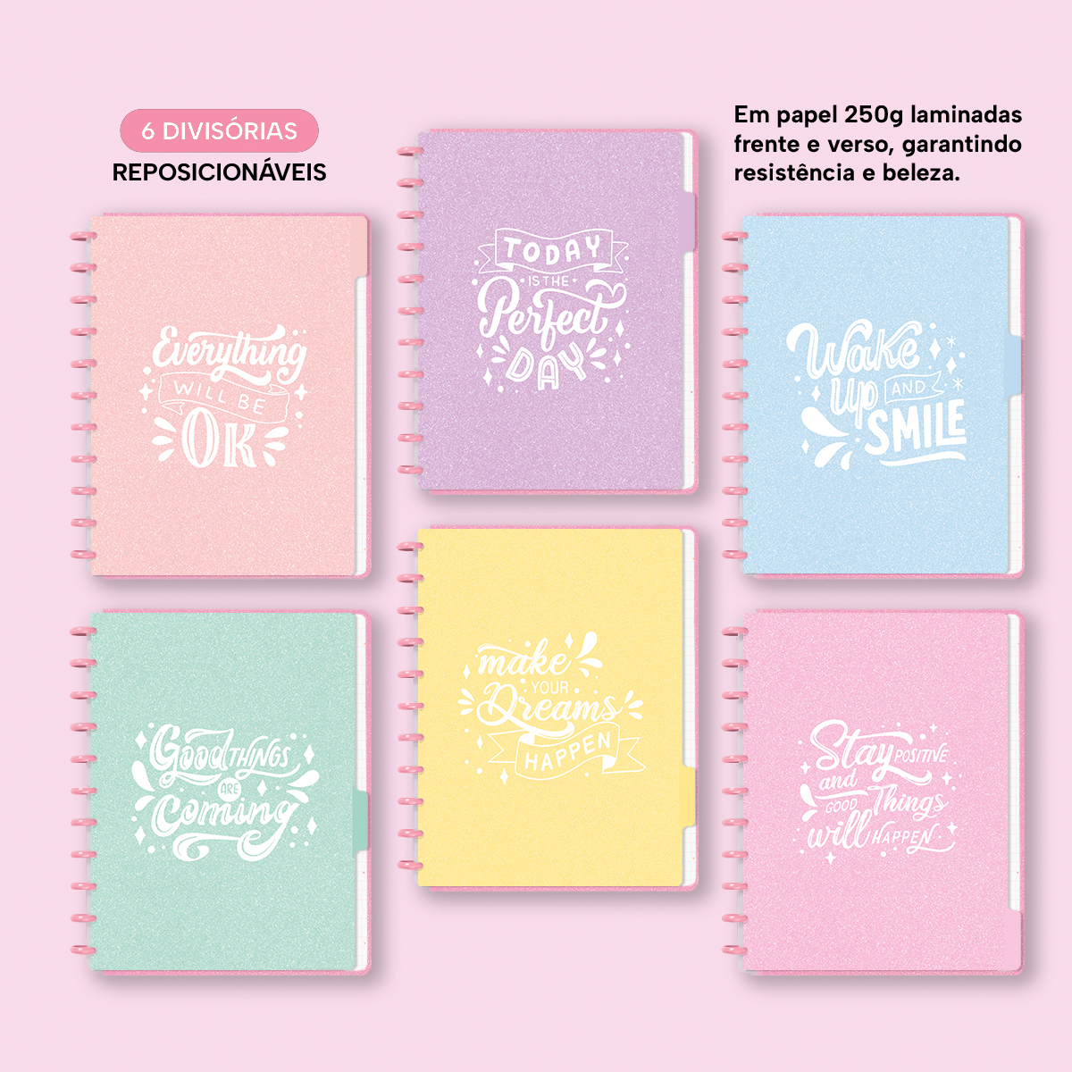 A capa é dura com impressão digital de alta definição, acompanha 6 lindas divisórias que você pode colocar em qualquer local do caderno, funcionando como o guia perfeito para sua organização.