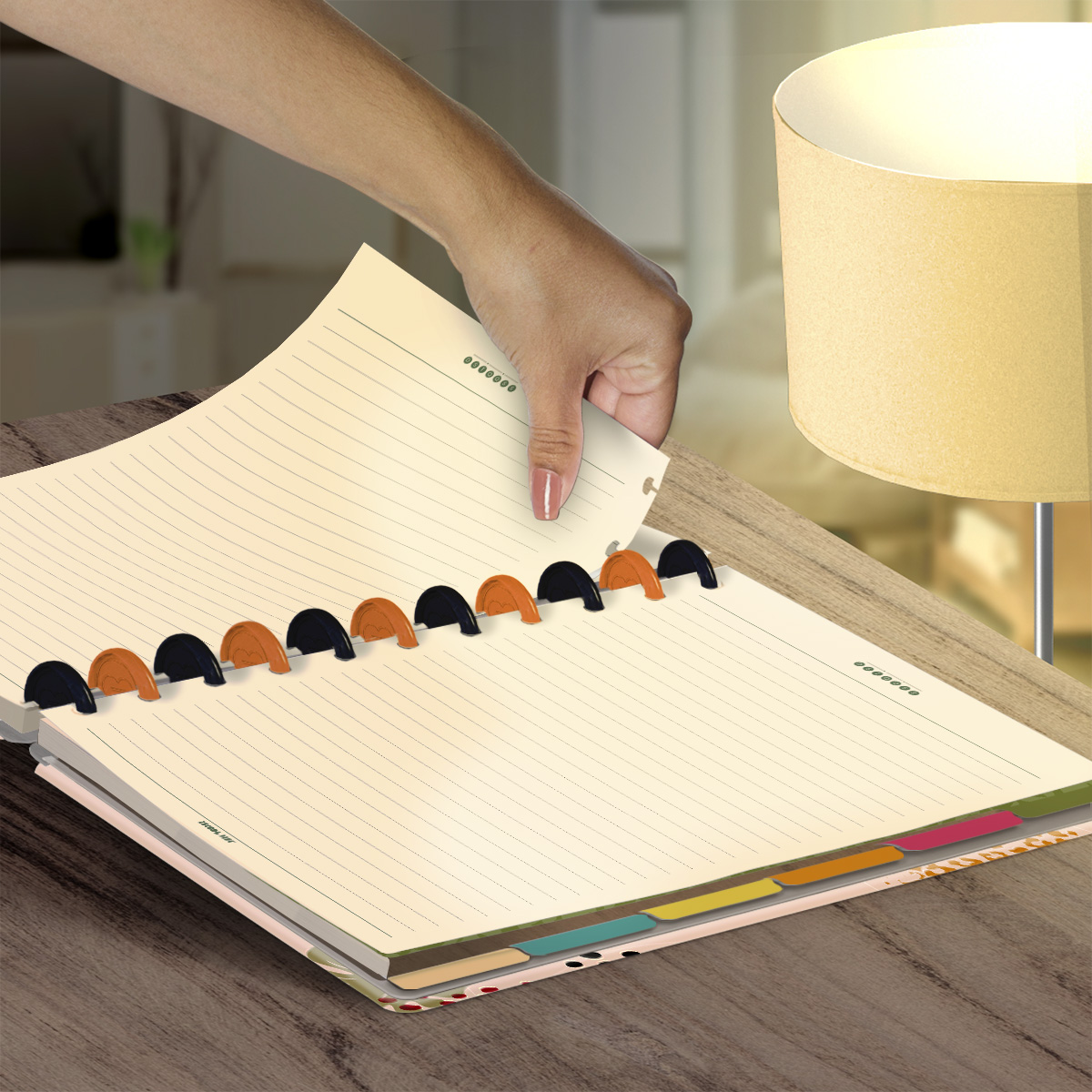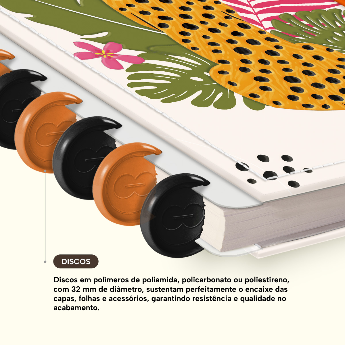 Encadernado com 11 discos M de 23mm em polímero de nylon e/ou policarbonato coloridos, fabricados no Brasil.