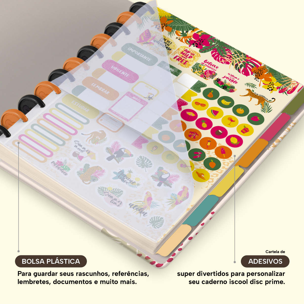 Além de tudo isso, o Iscool Disc Prime, conta com detalhezinhos que fazem toda diferença: elástico para fechamento da capa, muito mais estilo e privacidade para suas anotações; bolsa plástica para guardar seus rascunhos, referências, lembretes, documentos e uma cartela de adesivos incríveis, para que você possa personalizar seu caderno do seu jeitinho!
