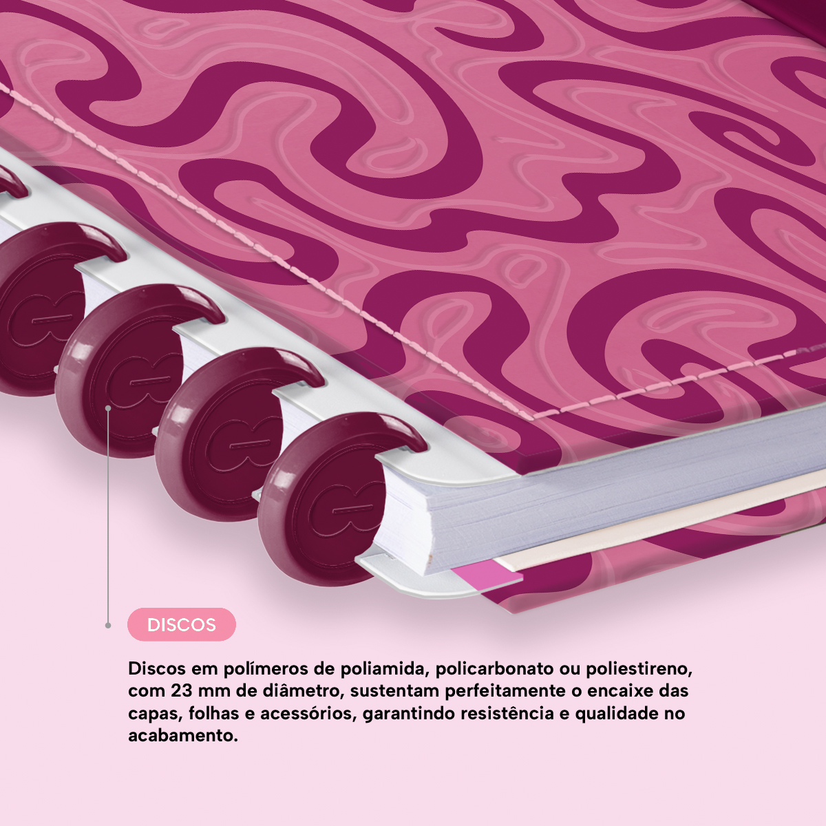 Os nossos discos são fabricados em polímero de nylon e/ou policarbonato, podem ser substituídos, proporcionando imensa variedade na combinação das cores, qualidade no acabamento e eficácia no encaixe das capas, folhas e acessórios.