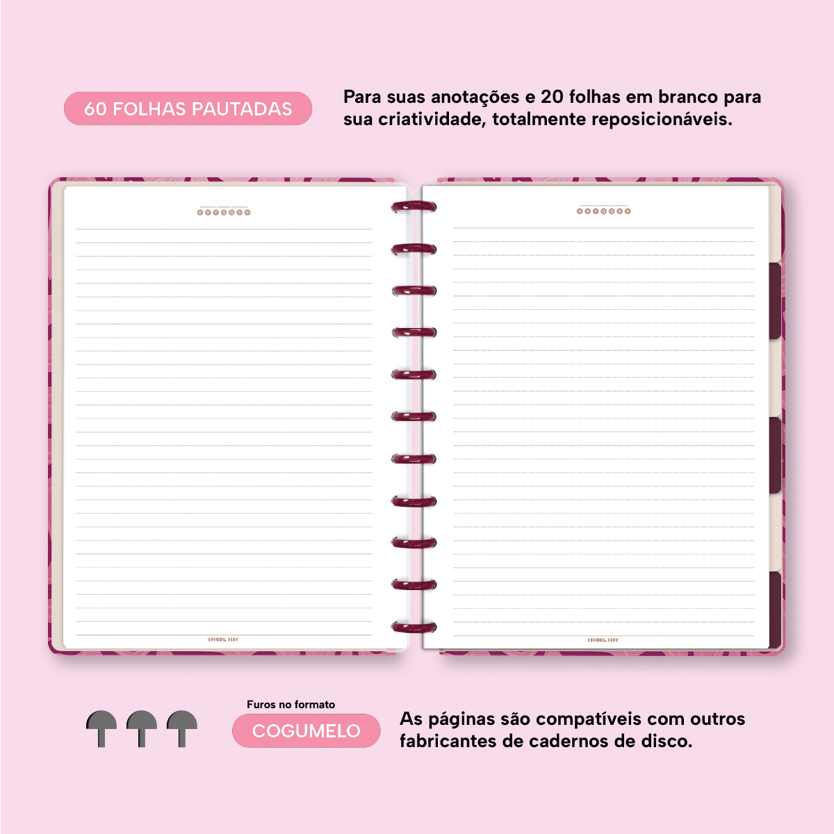Com furos no formato de “cogumelo”, você poderá dar um “up” em seu caderno com nossos refis, além de ser compatível com outros fabricantes de cadernos de discos.