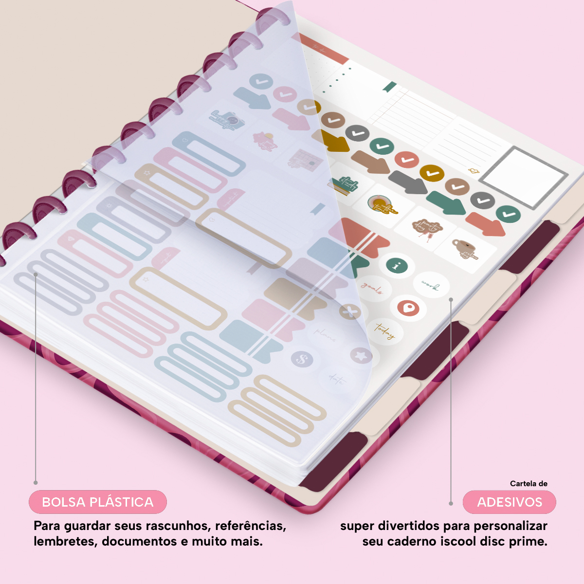 Além de tudo isso, o Iscool Disc Prime, conta com detalhezinhos que fazem toda diferença: elástico para fechamento da capa, muito mais estilo e privacidade para suas anotações; bolsa plástica para guardar seus rascunhos, referências, lembretes, documentos e uma cartela de adesivos incríveis, para que você possa personalizar seu caderno do seu jeitinho!