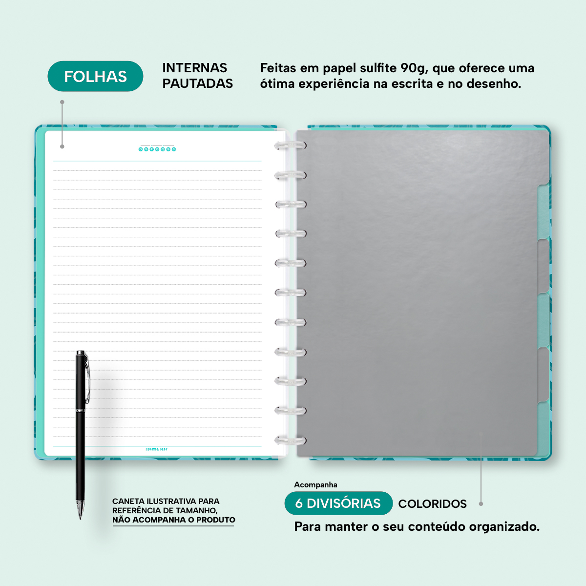 A capa é dura com impressão digital de alta definição, acompanha 6 lindas divisórias que você pode colocar em qualquer local do caderno, funcionando como o guia perfeito para sua organização.