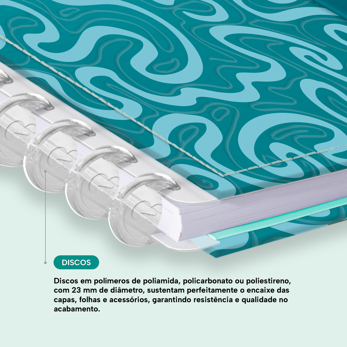 Os nossos discos são fabricados em polímero de nylon e/ou policarbonato, podem ser substituídos, proporcionando imensa variedade na combinação das cores, qualidade no acabamento e eficácia no encaixe das capas, folhas e acessórios.