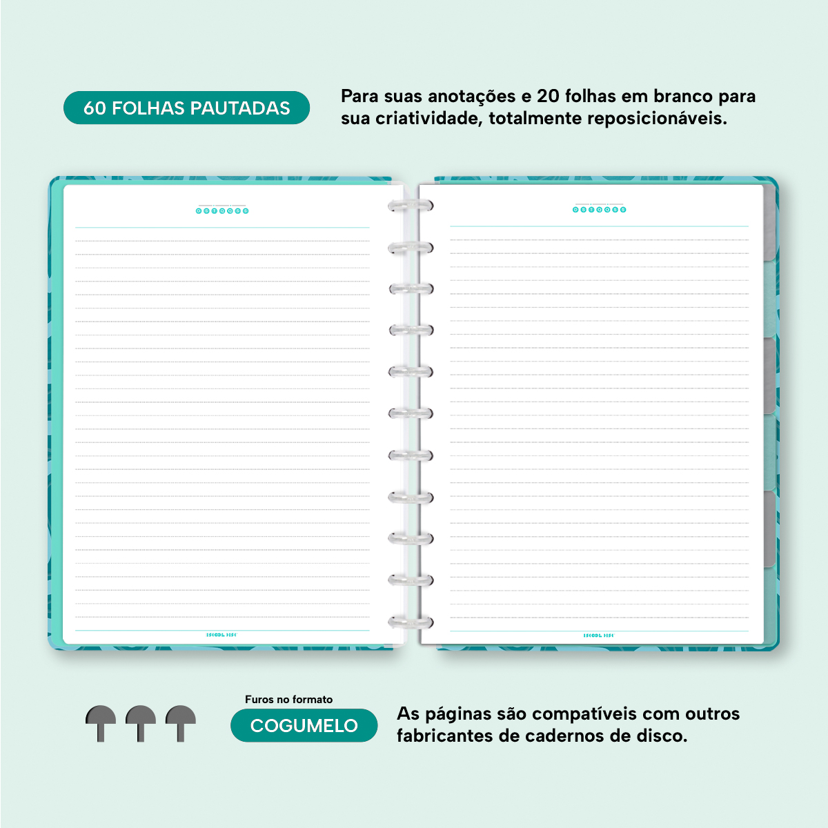 Com furos no formato de “cogumelo”, você poderá dar um “up” em seu caderno com nossos refis, além de ser compatível com outros fabricantes de cadernos de discos.