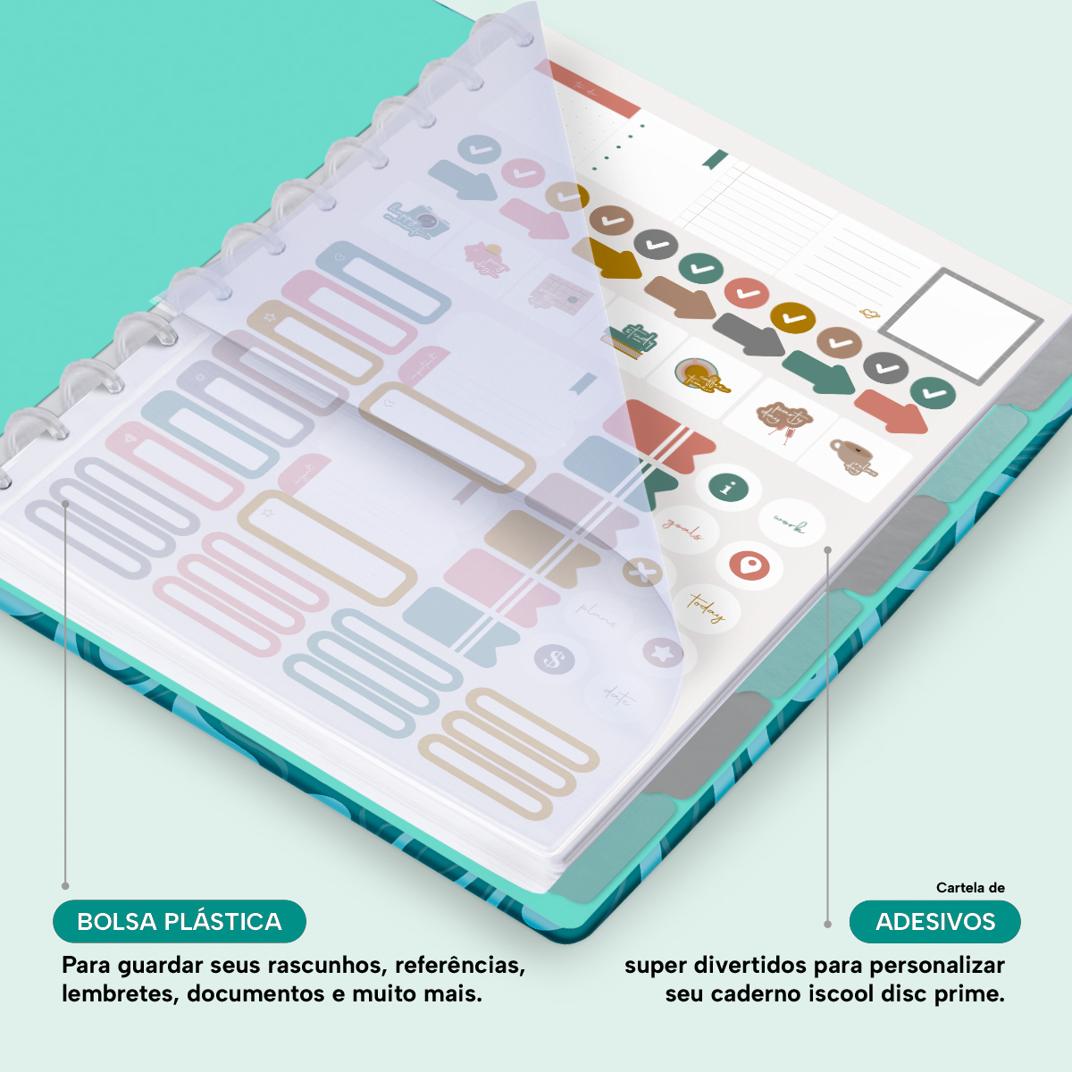 Além de tudo isso, o Iscool Disc Prime, conta com detalhezinhos que fazem toda diferença: elástico para fechamento da capa, muito mais estilo e privacidade para suas anotações; bolsa plástica para guardar seus rascunhos, referências, lembretes, documentos e uma cartela de adesivos incríveis, para que você possa personalizar seu caderno do seu jeitinho!