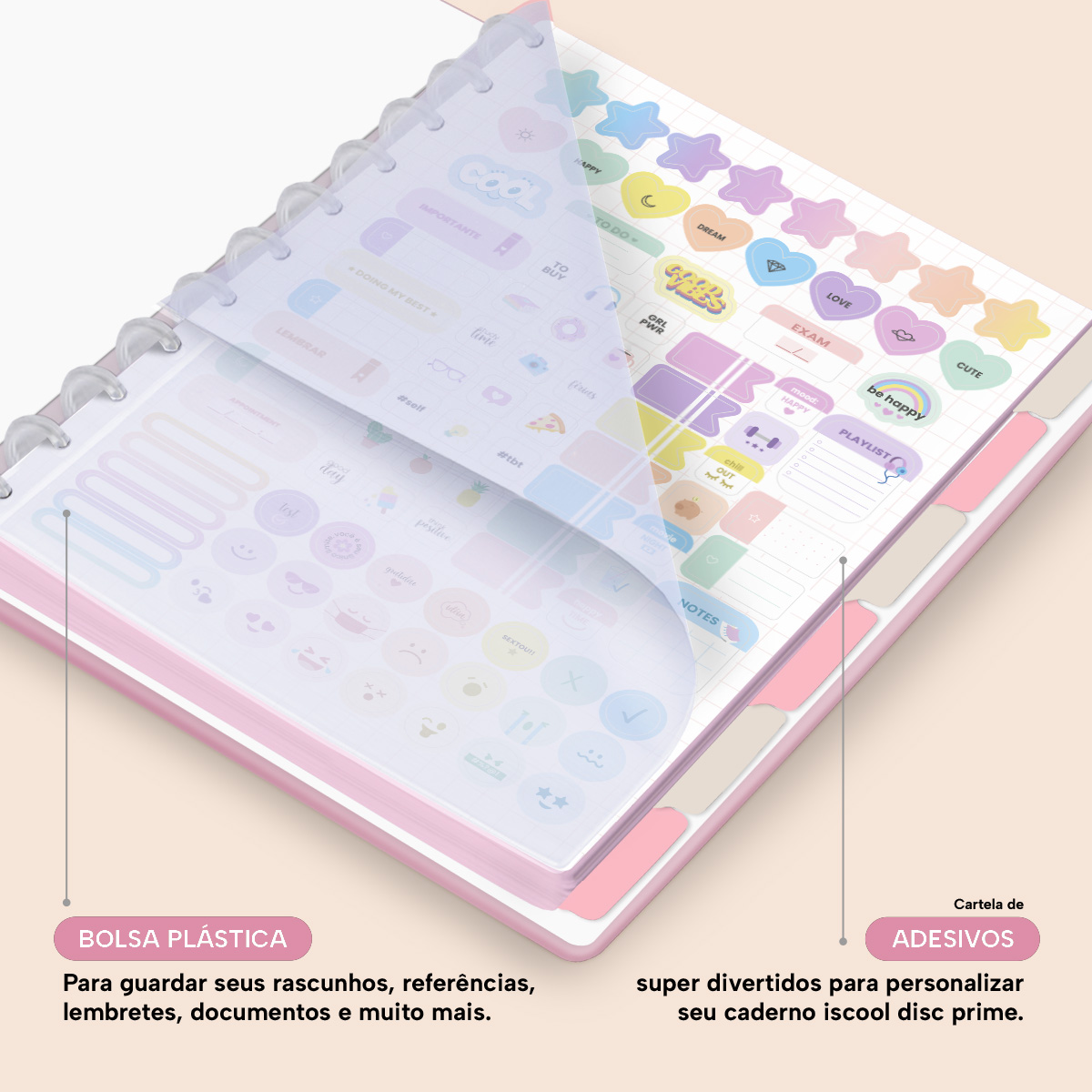 Além de tudo isso, o Iscool Disc Prime, conta com detalhezinhos que fazem toda diferença: elástico para fechamento da capa, muito mais estilo e privacidade para suas anotações; bolsa plástica para guardar seus rascunhos, referências, lembretes, documentos e uma cartela de adesivos incríveis, para que você possa personalizar seu caderno do seu jeitinho!