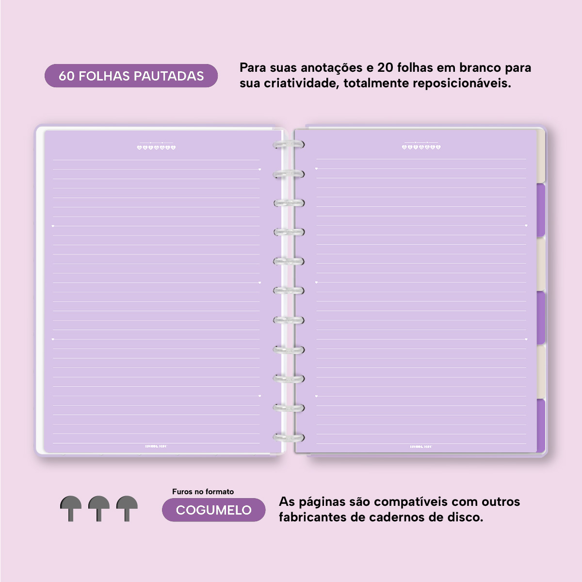 Com furos no formato de “cogumelo”, você poderá dar um “up” em seu caderno com nossos refis, além de ser compatível com outros fabricantes de cadernos de discos.