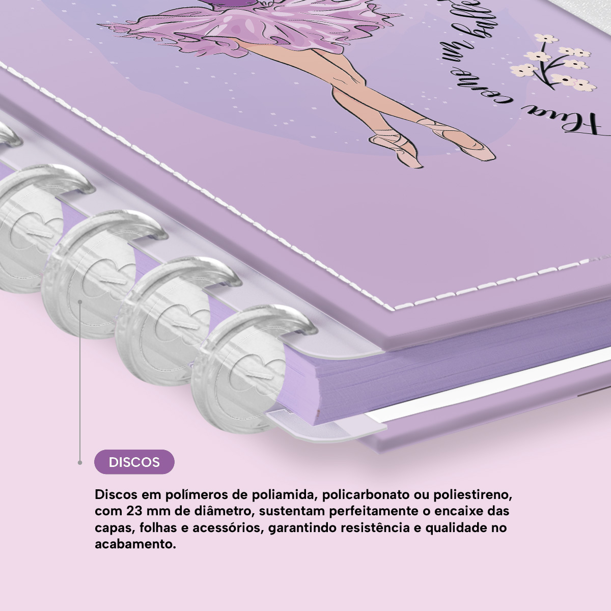 Os nossos discos são fabricados em polímero de nylon e/ou policarbonato, podem ser substituídos, proporcionando imensa variedade na combinação das cores, qualidade no acabamento e eficácia no encaixe das capas, folhas e acessórios.
