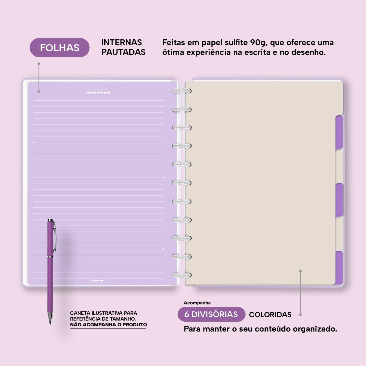 A capa é dura com impressão digital de alta definição, acompanha 6 lindas divisórias que você pode colocar em qualquer local do caderno, funcionando como o guia perfeito para sua organização.
