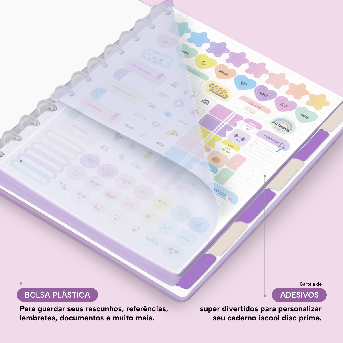 Além de tudo isso, o Iscool Disc Prime, conta com detalhezinhos que fazem toda diferença: elástico para fechamento da capa, muito mais estilo e privacidade para suas anotações; bolsa plástica para guardar seus rascunhos, referências, lembretes, documentos e uma cartela de adesivos incríveis, para que você possa personalizar seu caderno do seu jeitinho!