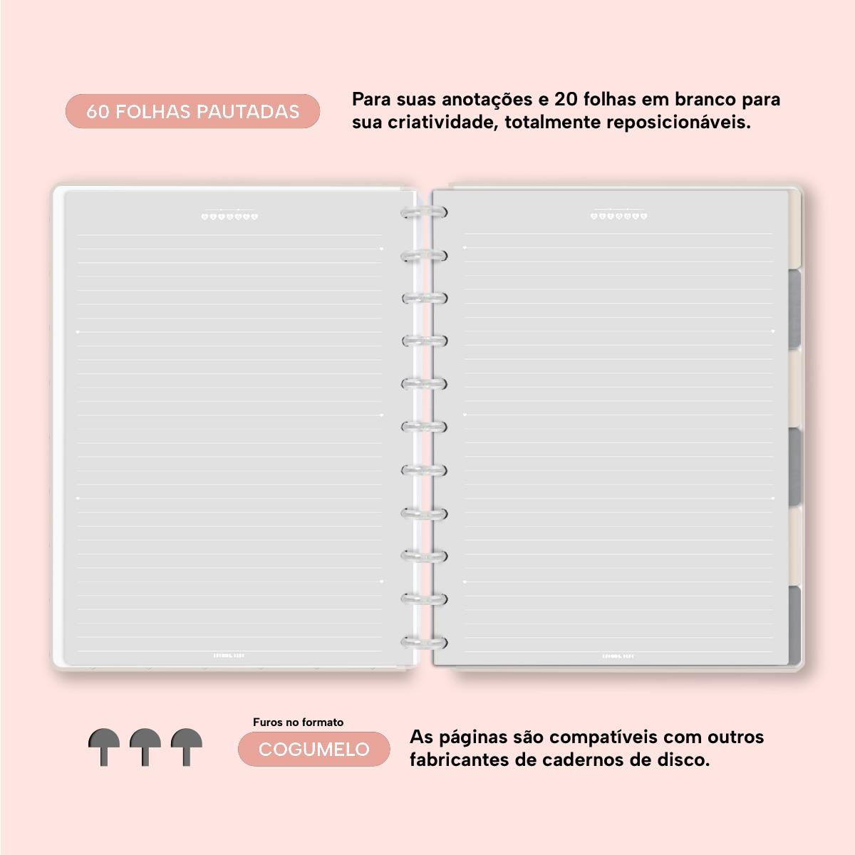 Com furos no formato de “cogumelo”, você poderá dar um “up” em seu caderno com nossos refis, além de ser compatível com outros fabricantes de cadernos de discos.