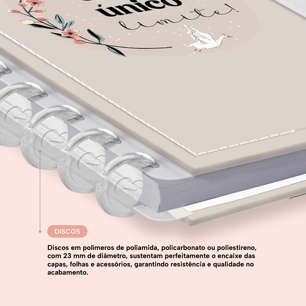 Os nossos discos são fabricados em polímero de nylon e/ou policarbonato, podem ser substituídos, proporcionando imensa variedade na combinação das cores, qualidade no acabamento e eficácia no encaixe das capas, folhas e acessórios.