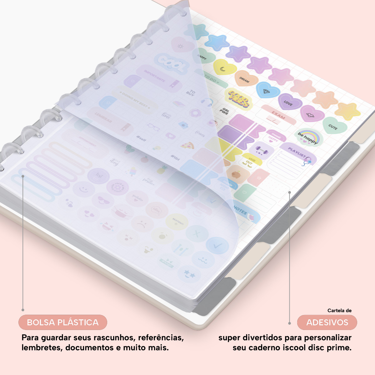 Além de tudo isso, o Iscool Disc Prime, conta com detalhezinhos que fazem toda diferença: elástico para fechamento da capa, muito mais estilo e privacidade para suas anotações; bolsa plástica para guardar seus rascunhos, referências, lembretes, documentos e uma cartela de adesivos incríveis, para que você possa personalizar seu caderno do seu jeitinho!