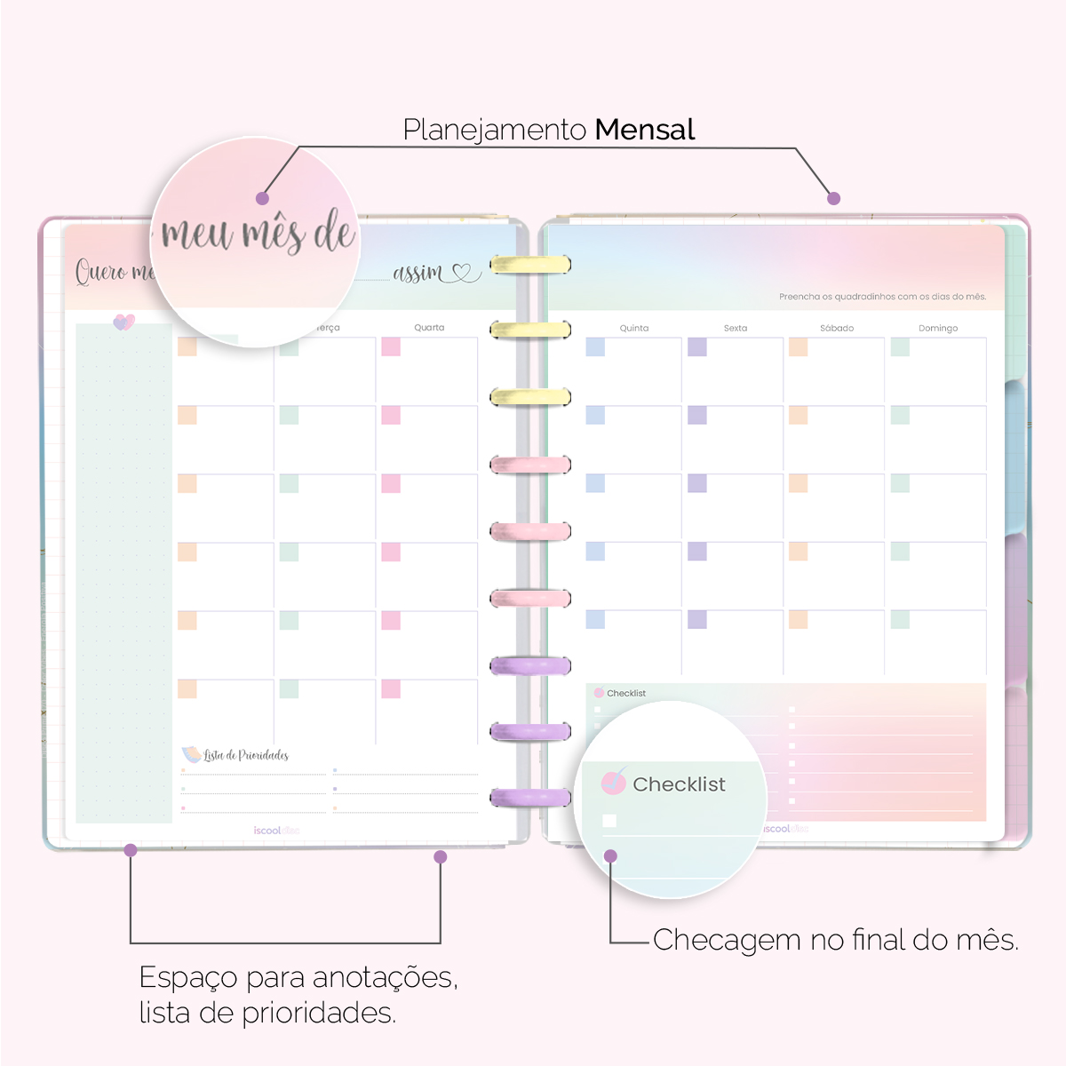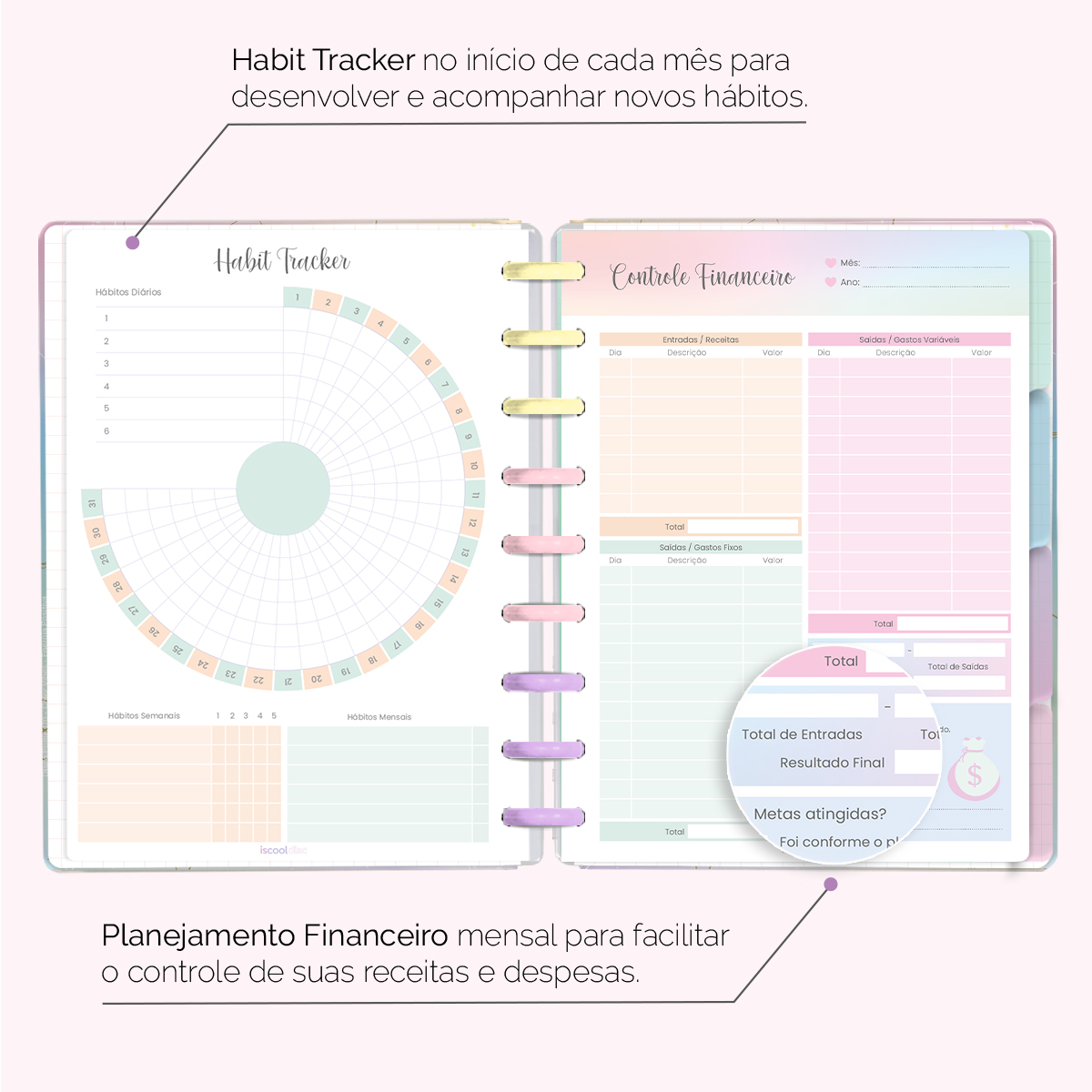 No início de cada mês, há um planejamento mensal, facilitando visualmente as suas principais anotações, um "Habit Tracker" para você desenvolver novos hábitos ou controlar os mais importantes, e ainda um planejamento financeiro, facilitando o controle das suas receitas e despesas, além de inúmeras outras funcionalidades.