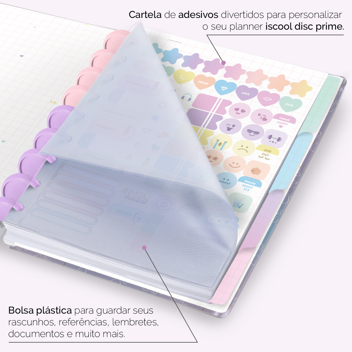 Além de tudo isso, o ISCOOL DISC Planner Permanente conta com detalhes que fazem toda a diferença: elástico para fechamento da capa, proporcionando muito mais estilo e privacidade para suas anotações; bolsa plástica para guardar seus rascunhos, referências, lembretes e documentos; e uma cartela de adesivos incríveis para que você possa personalizar o planner do seu jeitinho!